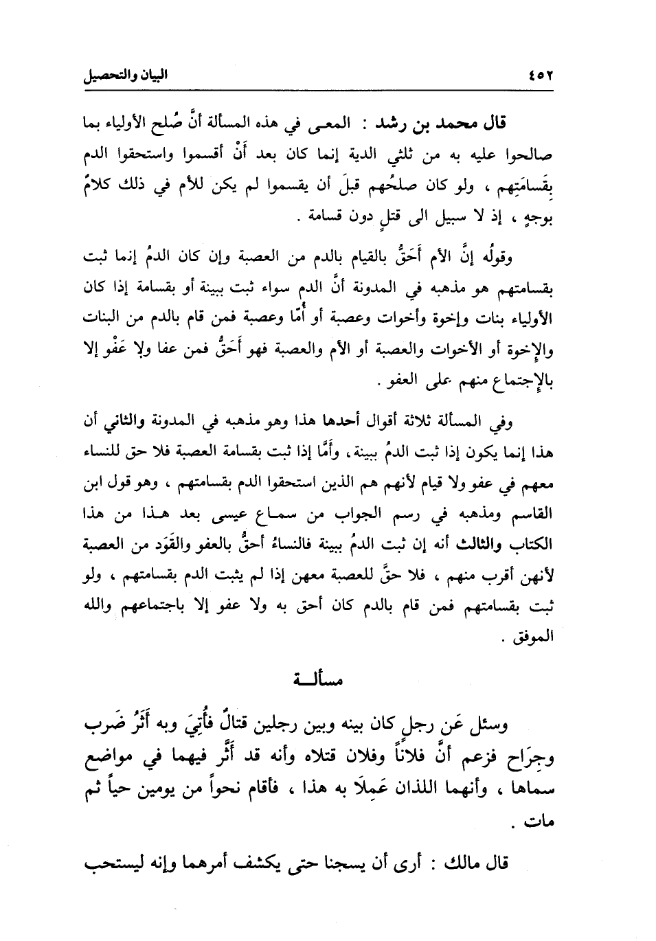 والثاني - أن هذا إنما يكون إذا ثبت الدم ببينة، وأما إذا ثبت بقسامة العصبة فلا حق للنساء معهم في عفو ولا قيام لأنهم هم الذين استحقوا الدم بقسامتهم، وهو قول ابن القاسم ومذهبه في رسم الجواب من سماع عيسى بعد هذا من هذا الكتاب.