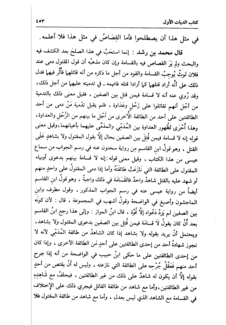قال محمد بن رشد: إنما استحب في هذا الصلح بعد الكشف فيه والبحث ولم ير القصاص فيه بالقسامة وإن كان مذهبه أن قول المقتول دمي عند فلان لوث يوجب القسامة والقود من أجل ما ذكره من أنه قاتلهما فأثر فيهما فدل ذلك على أنه أراد قتلهما كما أرادا قتله فاتهمه - في تدميته عليهما من أجل ذلك، وقد روي عنه أنه لا قسامة فيمن قتل بين الصفين، فقيل معنى ذلك بالتدمية من أجل أنهم تقاتلوا على زحل وعداوة، فلم يقبل تدمية من دمى من أحد الطائفتين على أحد من الطائفة الأخرى من أجل ما بينهم من الزحل والعداوة، وهذا أحرى لظهور العداوة بين المدمي والمدمى عليهما بأعيانهما، وقيل معنى قوله إنه لا قسامة فيمن قتل بين الصفين بحال إلا بقول المقتول ولا بشاهد على القتل، وهو قول ابن القاسم من رواية سحنون عنه في رسم الجواب من سماع عيسى من هذا الكتاب، وقيل معنى قوله: إنه لا قسامة بينهم بدعوى أولياء المقتول على الطائفة التي نازعت طائفته، وأما إذا دمى المقتول على واحد منهم أو شهد عليه بالقتل شاهد واحد فالقسامة في ذلك واجبة، وهو قول ابن القاسم أيضا من رواية عيسى عنه في رسم الجواب المذكور، وقول مطرف وابن الماجشون وأصبغ في الواضحة وقول أشهب في المجموعة، قال: لأن كونه بين الصفين لم يزد دعواه إلا قوة، قال ابن المواز: وإلى هذا رجع ابن القاسم بعد أن كان يقول لا قسامة فيمن قتل بين الصفين بدعوى المقتول ولا بشاهد، ويحتمل أن يريد بقوله ولا بشاهد إذا كان الشاهد من طائفة المدمي؛ لأنه لا تجوز شهادة أحد من إحدى الطائفتين على أحد من الطائفة الأخرى، وإذا كان من إحدى الطائفتين على ما حكى ابن حبيب في الواضحة من أنه إذا جرح أحد منهم فعقل جرحه على الطائفة التي نازعته، وليس له أن يقتص من أحد بقوله إلا أن يكون له شاهد على ذلك من غير الطائفتين، فيحلف مع شاهده من غير الطائفتين، وأما مع شاهد من طائفة القاتل فيجري ذلك على الاختلاف في القسامة مع الشاهد الذي ليس بعدل، وأما مع شاهد من طائفة المقتول فلا