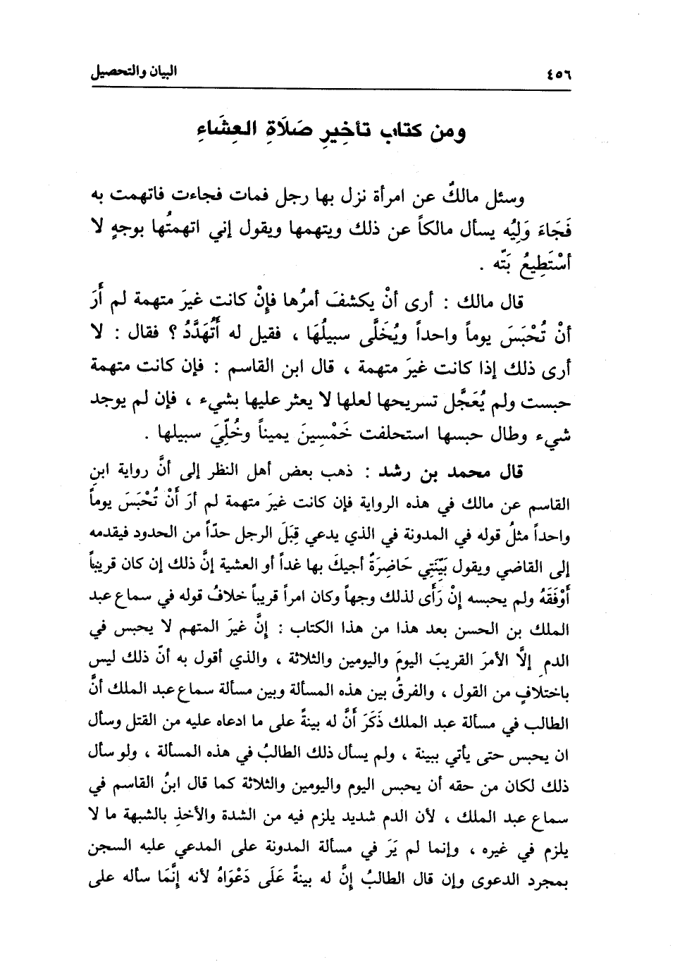 ومن كتاب تأخير صلاة العشاء وسئل مالك عن امرأة نزل بها رجل، فمات، فجاءت، فاتهمت به فجاء وليه يسأل مالكا عن ذلك ويتهمها ويقول إني اتهمتها بوجه لا أستطيع بته.