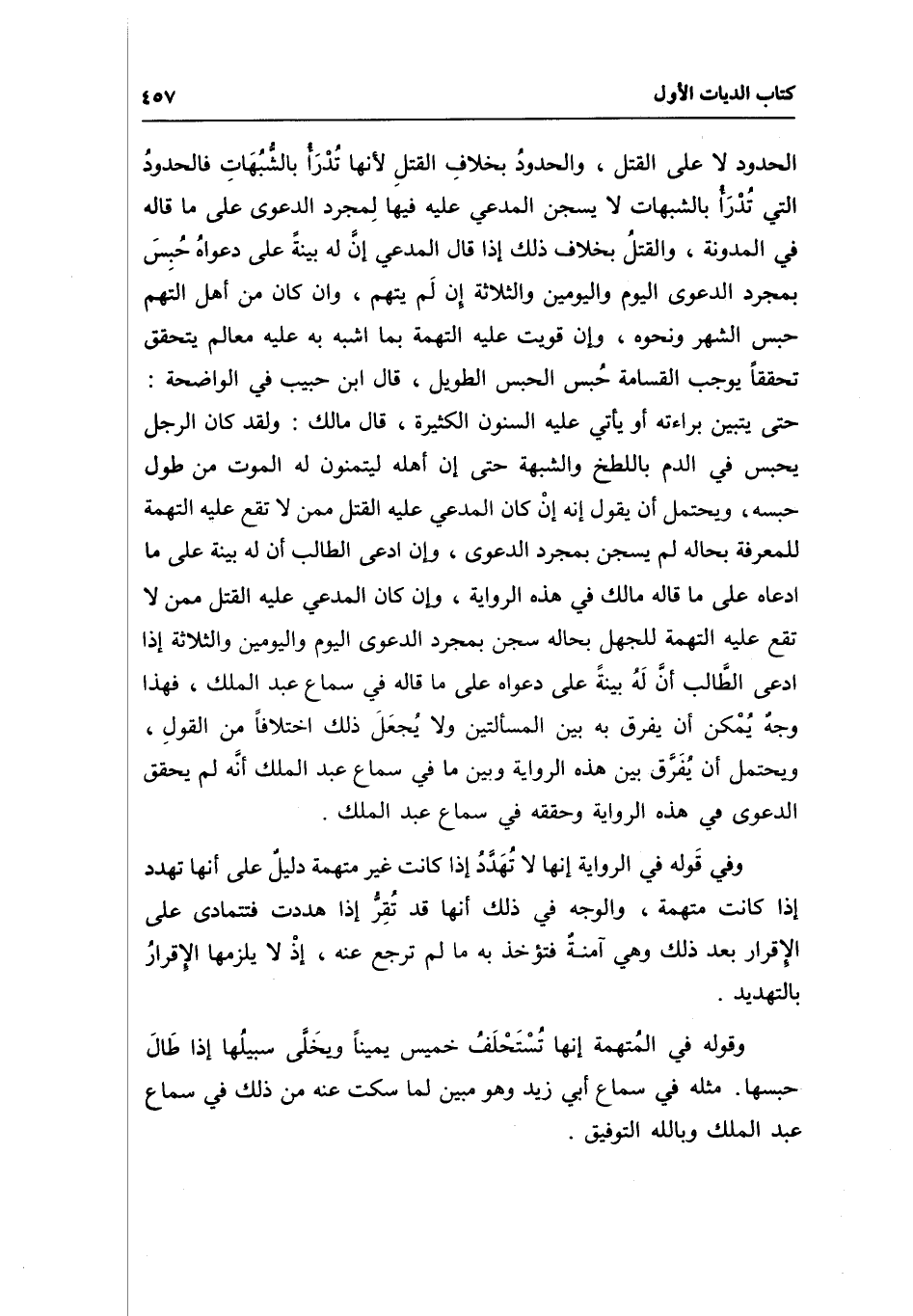 الحدود لا على القتل، والحدود بخلاف القتل؛ لأنها تدرأ بالشبهات فالحدود التي تدرأ بالشبهات لا يسجن المدعي عليه فيها لمجرد الدعوى على ما قاله في المدونة، والقتل بخلاف ذلك إذا قال المدعي: إن له بينة على دعواه حبس بمجرد الدعوى اليوم واليومين والثلاثة إن لم يتهم، وإن كان من أهل التهم حبس الشهر ونحوه، وإن قويت عليه التهمة بما أشبه به عليه معالم يتحقق تحققا يوجب القسامة حبس الحبس الطويل، قال ابن حبيب في الواضحة: حتى يتبين براءته أو يأتي عليه السنون الكثيرة، قال مالك: ولقد كان الرجل يحبس في الدم باللطخ والشبهة حتى إن أهله ليتمنون له الموت من طول حبسه، ويحتمل أن يقول: إنه إن كان المدعي عليه القتل ممن لا تقع عليه التهمة للمعرفة بحاله لم يسجن بمجرد الدعوى، وإن ادعى الطالب أن له بينة على ما ادعاه على ما قاله مالك في هذه الرواية، وإن كان المدعي عليه القتل ممن لا تقع عليه التهمة للجهل بحاله سجن بمجرد الدعوى اليوم واليومين والثلاثة إذا ادعى الطالب أن له بينة على دعواه على ما قاله في سماع عبد الملك، فهذا وجه يمكن أن يفرق به بين المسألتين ولا يجعل ذلك اختلافا من القول، ويحتمل أن يفرق بين هذه الرواية وبين ما في سماع عبد الملك أنه لم يحقق الدعوى في هذه الرواية وحققه في سماع عبد الملك.