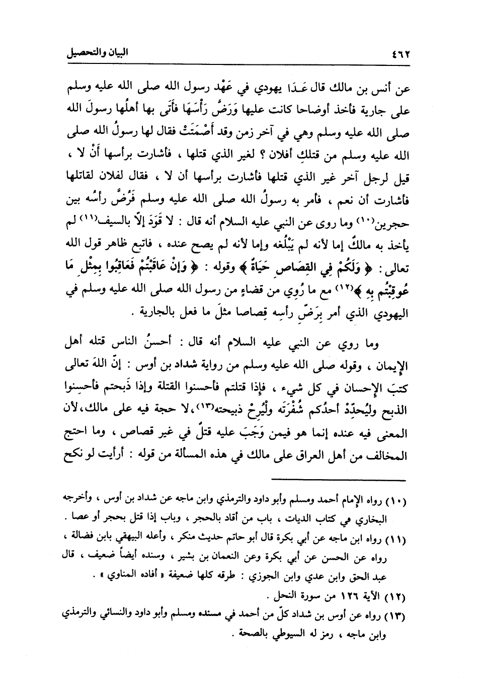 وما روي عن النبي - عَلَيْهِ السَّلَامُ - أنه قال: «أحسن الناس قتلة أهل الإيمان» وقوله - صَلَّى اللَّهُ عَلَيْهِ وَسَلَّمَ - من رواية شداد بن أوس: «إن الله تعالى كتب الإحسان في كل شيء، فإذا قتلتم فأحسنوا القتلة وإذا ذبحتم فأحسنوا الذبح وليحدد أحدكم شفرته وليرح ذبيحته» لا حجة فيه على مالك؛ لأن المعنى فيه عنده إنما هو فيمن وجب عليه قتل في غير قصاص، وما احتج المخالف من أهل العراق على مالك في هذه المسألة من قوله: أرأيت لو نكح