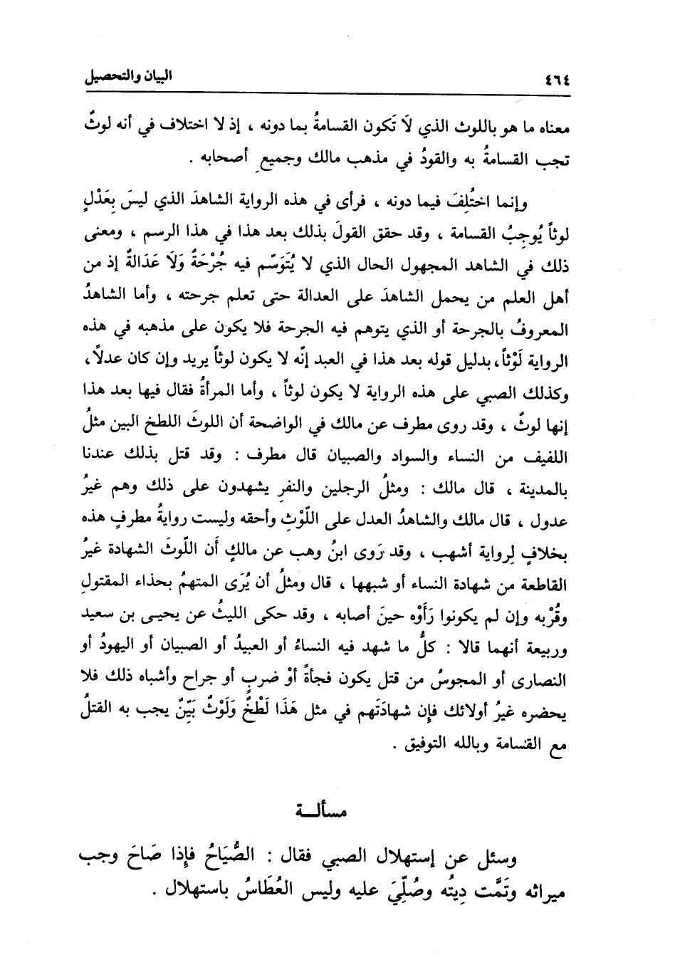 وإنما اختلف فيما دونه، فرأى في هذه الرواية الشاهد الذي ليس بعدل لوثا يوجب القسامة، وقد حقق القول بذلك بعد هذا في هذا الرسم، ومعنى ذلك في الشاهد المجهول الحال الذي لا يتوسم فيه جرحة ولا عدالة إذ من أهل العلم من يحمل الشاهد على العدالة حتى تعلم جرحته، وأما الشاهد المعروف بالجرحة أو الذي يتوهم فيه الجرحة فلا يكون على مذهبه في هذه الرواية لوثا، بدليل قوله بعد هذا في العبد إنه لا يكون لوثا يريد وإن كان عدلا، وكذلك الصبي على هذه الرواية لا يكون لوثا، وأما المرأة فقال فيها بعد هذا إنها لوث، وقد روى مطرف عن مالك في الواضحة أن اللوث اللطخ البين مثل اللفيف من النساء والسواد والصبيان قال مطرف: وقد قتل بذلك عندنا بالمدينة، قال مالك: ومثل الرجلين والنفر يشهدون على ذلك وهم غير عدول، قال مالك: والشاهد العدل على اللوث وأحقه، وليست رواية مطرف هذه بخلاف لرواية أشهب، وقد روى ابن وهب عن مالك أن اللوث الشهادة غير القاطعة من شهادة النساء أو شبهها، قال ومثل أن يرى المتهم بحذاء المقتول وقربه وإن لم يكونوا رأوه حين أصابه، وقد حكى الليث عن يحيى بن سعيد وربيعة أنهما قالا: كل ما شهد فيه النساء أو العبيد أو الصبيان أو اليهود أو النصارى أو المجوس من قتل يكون فجأة أو ضرب أو جراح وأشباه ذلك فلا يحضره غير أولئك فإن شهادتهم في مثل هذا لطخ ولوث بين يجب به القتل مع القسامة وبالله التوفيق.