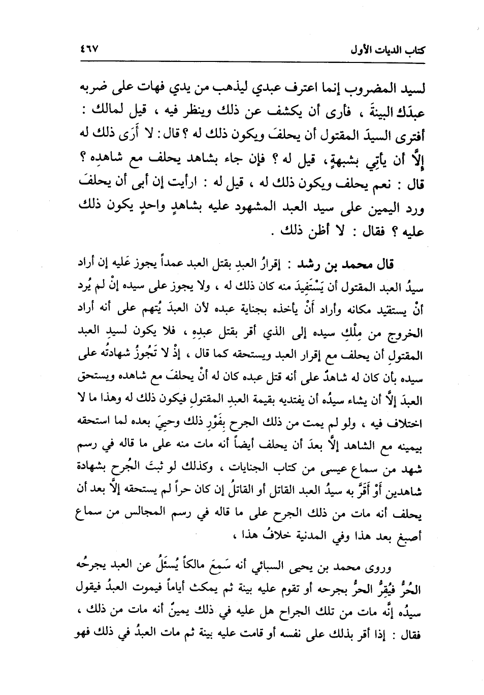 لسيد المضروب إنما اعترف عبدي ليذهب من يدي فهات على ضربه عبدك البينة، فأرى أن يكشف عن ذلك وينظر فيه، قيل لمالك: أفترى السيد المقتول أن يحلف ويكون ذلك له؟ قال: لا أرى ذلك له إلا أن يأتي بشبهة، قيل له؟ فإن جاء بشاهد يحلف مع شاهده؟ قال: نعم يحلف ويكون ذلك له، قيل له: أرأيت إن أبى أن يحلف ورد اليمين على سيد العبد المشهود عليه بشاهد واحد يكون ذلك عليه؟ فقال: لا أظن ذلك.