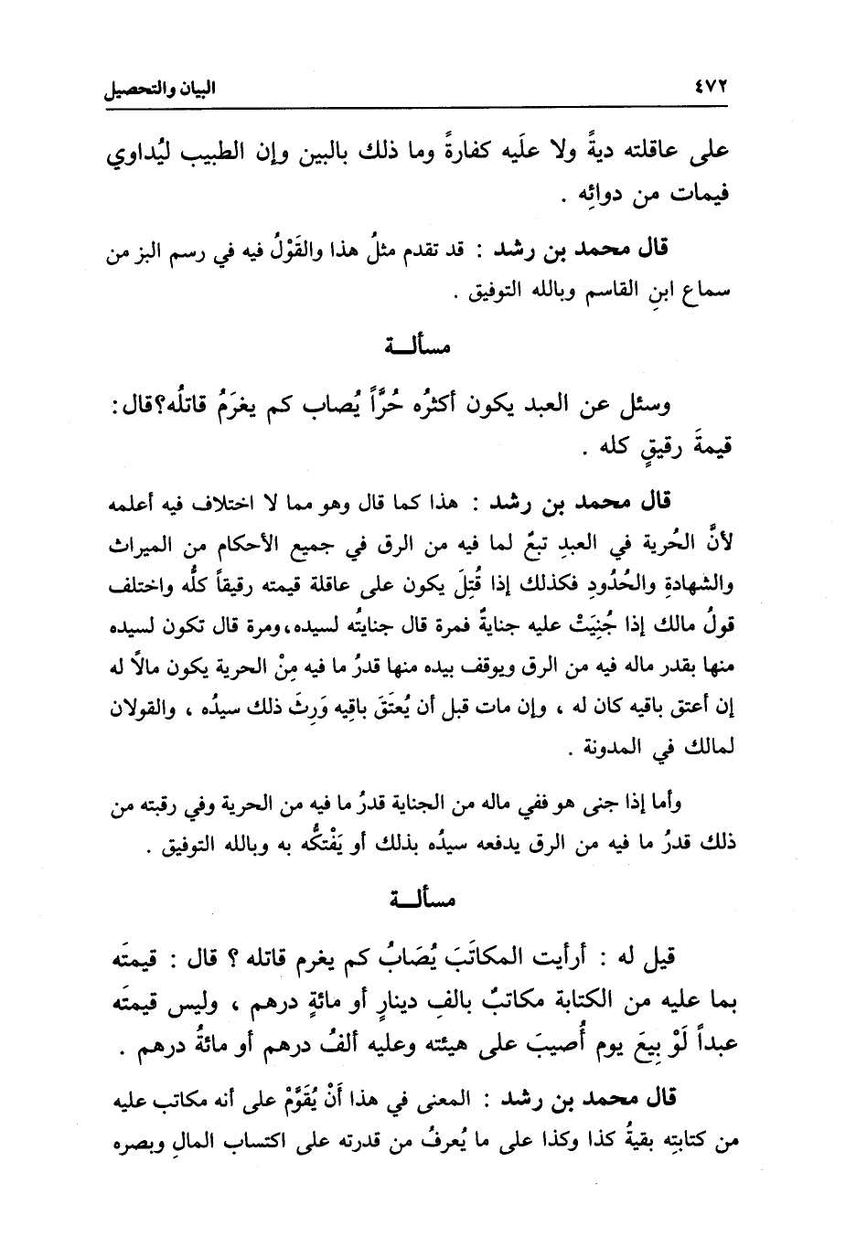 قال محمد بن رشد: هذا كما قال وهو مما لا اختلاف فيه أعلمه لأن الحرية في العبد تبع لما فيه من الرق في جميع الأحكام من الميراث والشهادة والحدود فكذلك إذا قتل يكون على عاقلة قيمته رقيقا كله واختلف قول مالك إذا جنيت عليه جناية فمرة قال جنايته لسيده، ومرة قال تكون لسيده منها بقدر ماله فيه من الرق ويوقف بيده منها قدر ما فيه من الحرية يكون مالا له إن أعتق باقيه كان له، وإن مات قبل أن يعتق باقيه ورث ذلك سيده، والقولان لمالك في المدونة.