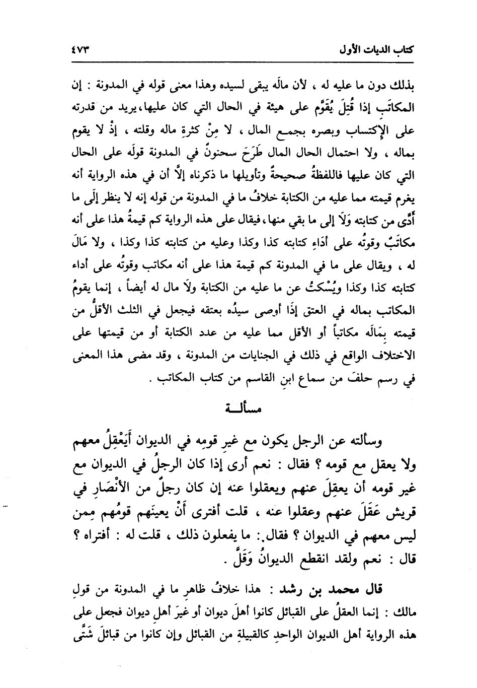 مسألة وسألته عن الرجل يكون مع غير قومه في الديوان أيعقل معهم ولا يعقل مع قومه؟ فقال: نعم أرى إذا كان الرجل في الديوان مع غير قومه أن يعقل عنهم ويعقلوا عنه إن كان رجل من الأنصار في قريش عقل عنهم وعقلوا عنه، قلت أفترى أن يعينهم قومهم ممن ليس معهم في الديوان؟ فقال: ما يفعلون ذلك، قلت له: أفتراه؟ قال: نعم ولقد انقطع الديوان وقل.