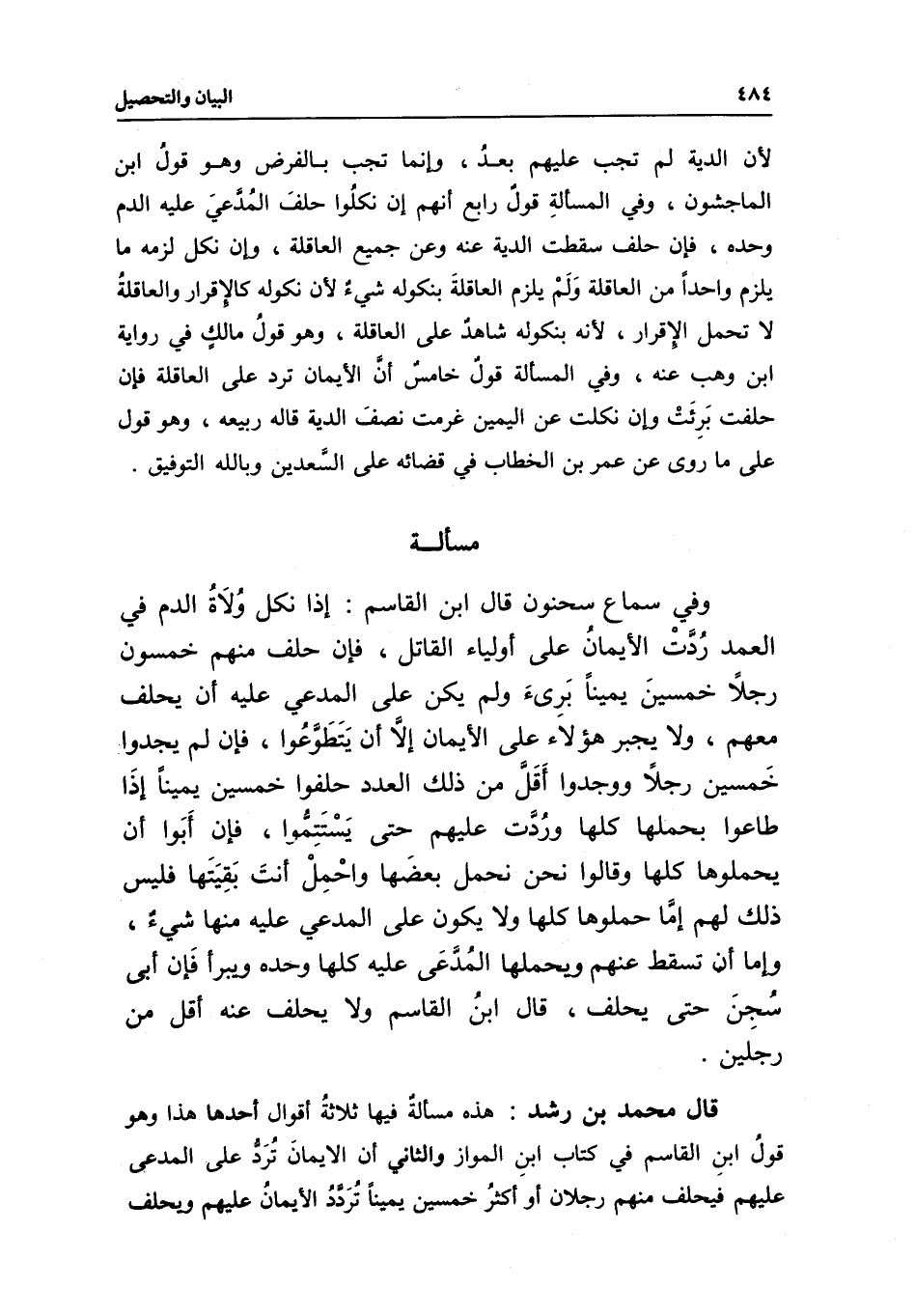 مسألة وفي سماع سحنون قال ابن القاسم: إذا نكل ولاة الدم في العمد ردت الأيمان على أولياء القاتل، فإن حلف منهم خمسون رجلا خمسين يمينا برئ، ولم يكن على المدعي عليه أن يحلف معهم، ولا يجبر هؤلاء على الأيمان إلا أن يتطوعوا، فإن لم يجدوا خمسين رجلا ووجدوا أقل من ذلك العدد حلفوا خمسين يمينا إذا أطاعوا بحملها كلها وردت عليهم حتى يستتموا، فإن أبوا أن يحملوها كلها، وقالوا نحن نحمل بعضها واحمل أنت بقيتها، فليس ذلك لهم إما حملوها كلها ولا يكون على المدعي عليه منها شيء، وإما أن تسقط عنهم ويحملها المدعى عليه كلها وحده ويبرأ، فإن أبى سجن حتى يحلف، قال ابن القاسم ولا يحلف عنه أقل من رجلين.