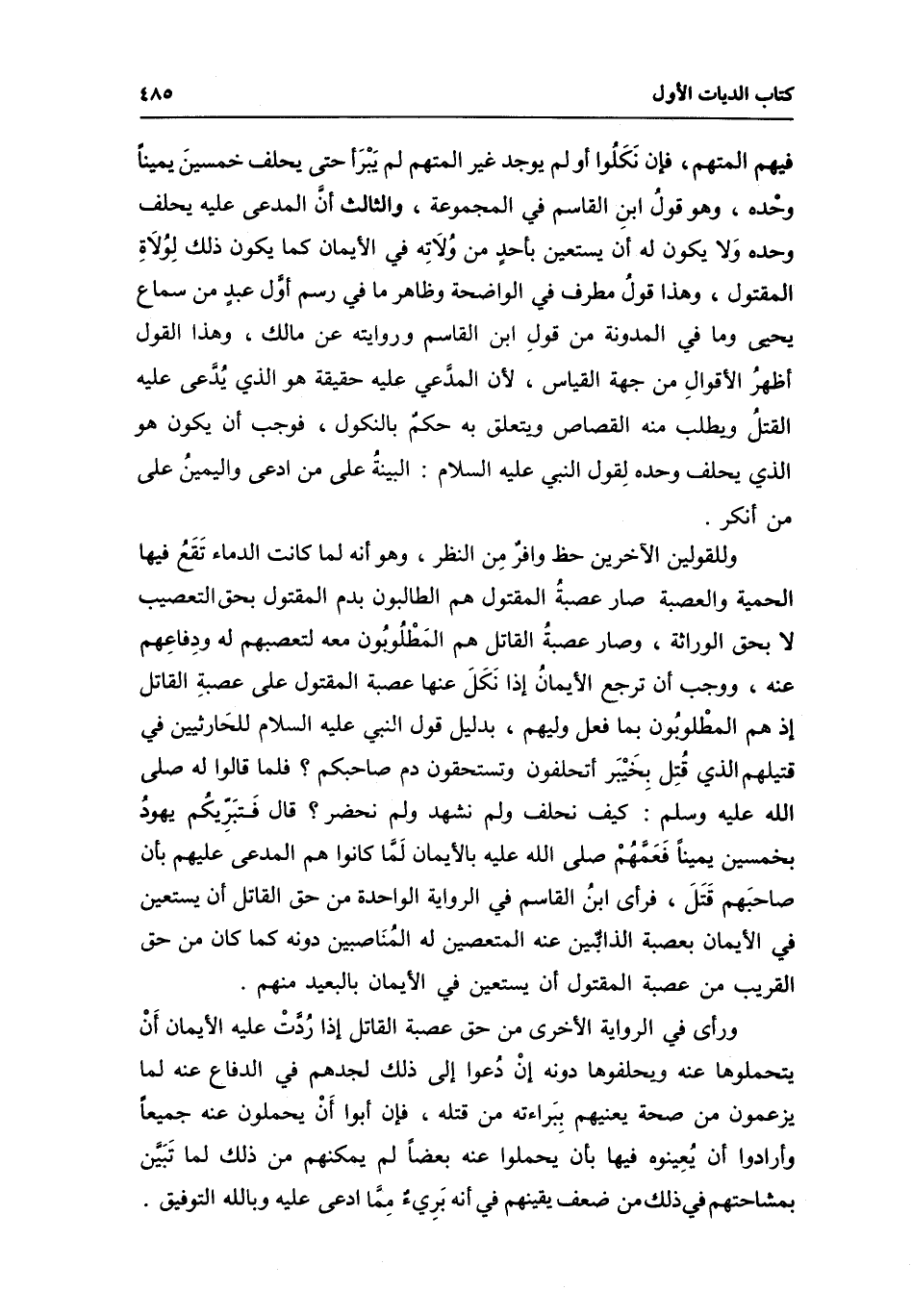 وللقولين الآخرين حظ وافر من النظر، وهو أنه لما كانت الدماء تقع فيها الحمية والعصبة صار عصبة المقتول هم الطالبون بدم المقتول بحق التعصيب لا بحق الوراثة، وصار عصبة القاتل هم المطلوبون معه لتعصبهم له ودفاعهم عنه، ووجب أن ترجع الأيمان إذا نكل عنها عصبة المقتول على عصبة القاتل إذ هم المطلوبون بما فعل وليهم، بدليل «قول النبي - عَلَيْهِ السَّلَامُ - للحارثيين في قتيلهم الذي قتل بخيبر أتحلفون وتستحقون دم صاحبكم؟ فلما قالوا له - صَلَّى اللَّهُ عَلَيْهِ وَسَلَّمَ -: كيف نحلف ولم نشهد ولم نحضر؟ قال فتبريكم يهود بخمسين يمينا» فعمهم صَلَّى اللَّهُ عَلَيْهِ بالأيمان لما كانوا هم المدعى عليهم بأن صاحبهم قتل، فرأى ابن القاسم في الرواية الواحدة من حق القاتل أن يستعين في الأيمان بعصبة الذابين عنه المتعصين له المناصبين دونه كما كان من حق القريب من عصبة المقتول أن يستعين في الأيمان بالبعيد منهم.