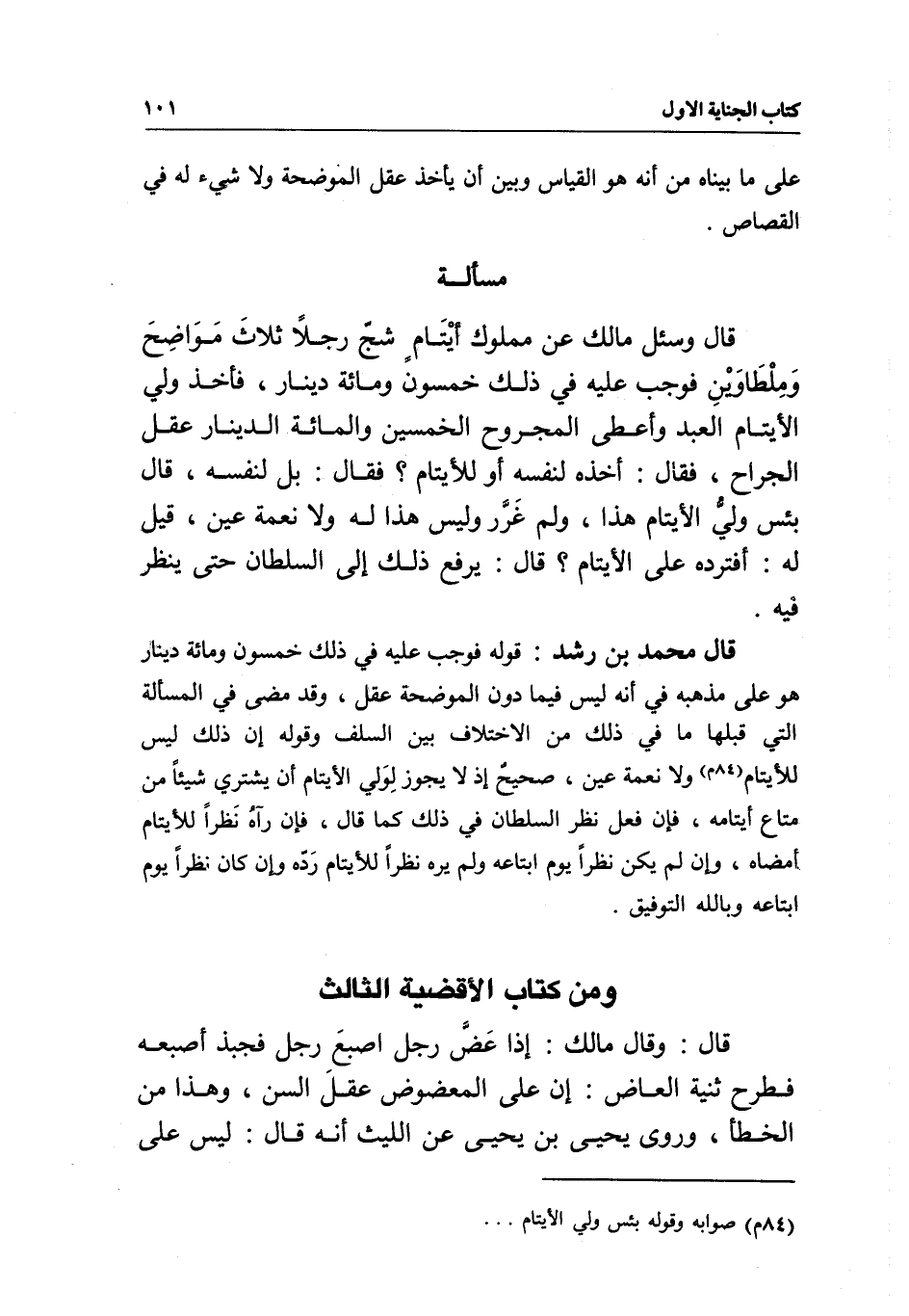 قال محمد بن رشد: قوله فوجب عليه في ذلك خمسون ومائة دينار هو على مذهبه في أنه ليس فيما دون الموضحة عقل، وقد مضى في المسألة التي قبلها ما في ذلك من الاختلاف بين السلف وقوله: إن ذلك ليس للأيتام ولا نعمة عين، صحيح إذ لا يجوز لولي الأيتام أن يشتري شيئا من متاع أيتامه، فإن فعل نظر السلطان في ذلك كما قال، فإن رآه نظرا للأيتام أمضاه، وإن لم يكن نظرا يوم ابتاعه ولم يره نظرا للأيتام رده وإن كان نظرا يوم ابتاعه وبالله التوفيق.