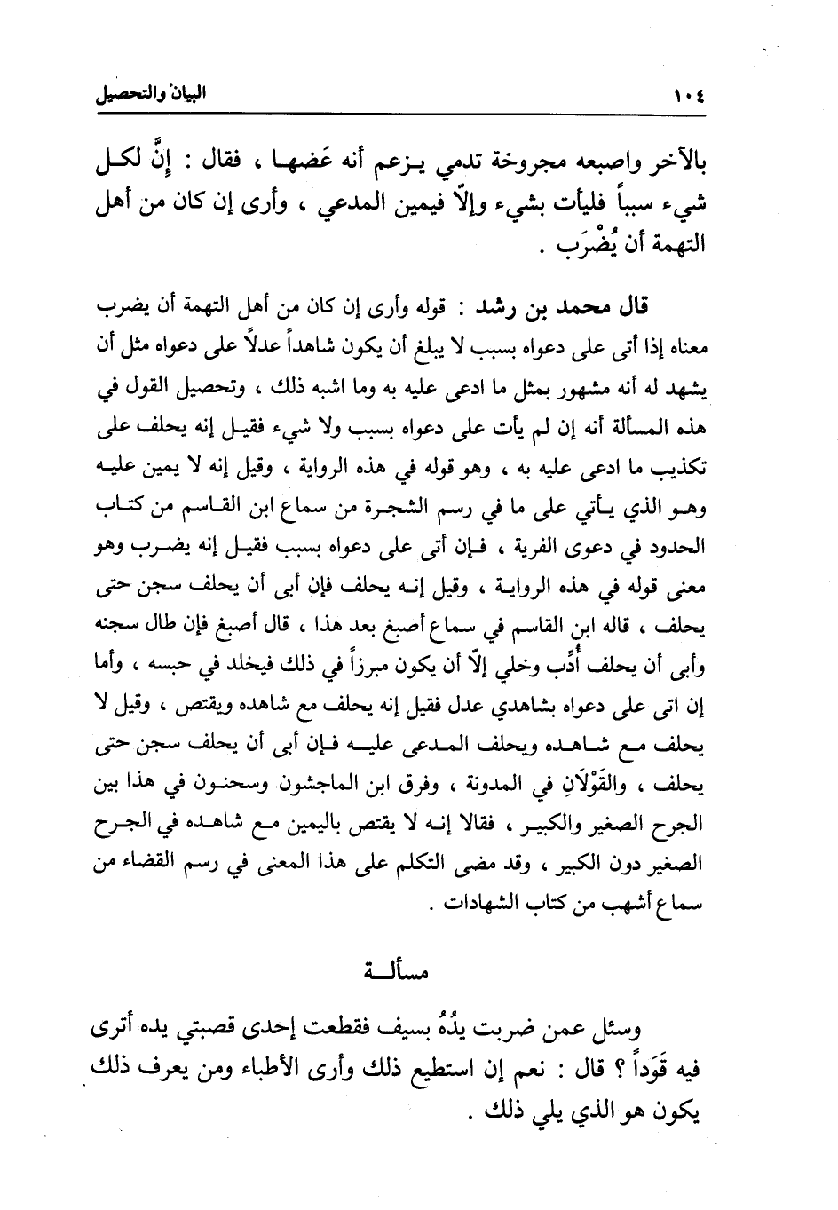مسألة وسئل عمن ضربت يده بسيف فقطعت إحدى قصبتي يده أترى فيه قودا؟ قال: نعم إن استُطيع ذلك وأرى الأطباء ومن يعرف ذلك يكون هو الذي يلي ذلك.
