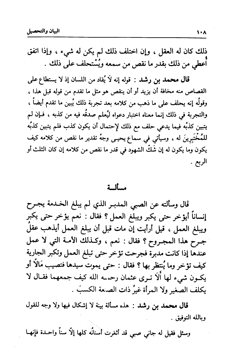 مسألة قال وسألته عن الصبي المدبر الذي لم يبلغ الخدمة يجرح إنسانا أيؤخر حتى يكبر ويبلغ العمل؟ فقال: نعم يؤخر حتى يكبر ويبلغ العمل، قيل أرأيت إن مات قبل أن يبلغ العمل أيذهب عقل جرح هذا المجروح؟ فقال: نعم، وكذلك الأمة التي لا عمل عندها إذا كانت مدبرة فجرحت تؤخر حتى تبلغ العمل وتكبر الجارية كيف تؤخر وما ينتظر بها؟ فقال: حتى يموت سيدها فتصيب مالا أو يكون شيء لها ألا ترى عثمان - رَحِمَهُ اللَّهُ - كيف جمعهما فقال: لا يكلف الصغير ولا المرأة غير ذات الصنعة الكسب.