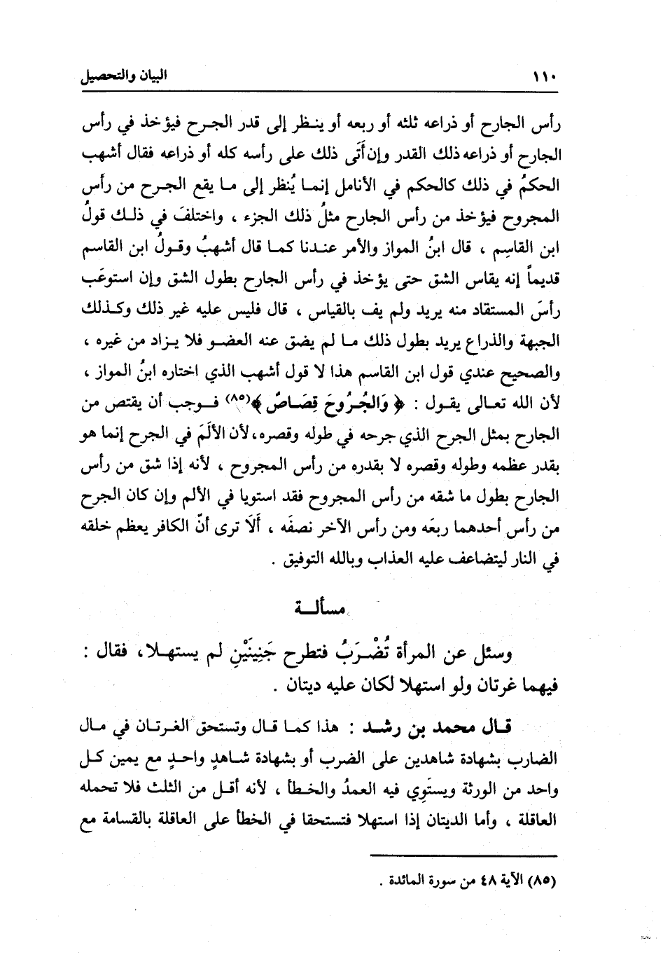 رأس الجارح أو ذراعه ثلثه أو ربعه أو ينظر إلى قدر الجرح فيؤخذ في رأس الجارح أو ذراعه ذلك القدر وإن أتى ذلك على رأسه كله أو ذراعه فقال أشهب الحكم في ذلك كالحكم في الأنامل إنما ينظر إلى ما يقع الجرح من رأس المجروح فيؤخذ من رأس الجارح مثل ذلك الجزء، واختلف في ذلك قول ابن القاسم، قال ابن المواز والأمر عندنا كما قال أشهب وقول ابن القاسم قديما إنه يقاس الشق حتى يؤخذ في رأس الجارح بطول الشق وإن استوعب رأس المستقاد منه يريد ولم يف بالقياس، قال فليس عليه غير ذلك وكذلك الجبهة والذراع يريد بطول ذلك ما لم يضق عنه العضو فلا يزاد من غيره، والصحيح عندي قول ابن القاسم هذا لا قول أشهب الذي اختاره ابن المواز؛ لأن الله تعالى يقول: {وَالْجُرُوحَ قِصَاصٌ} [المائدة: 45] فوجب أن يقتص من الجارح بمثل الجرح الذي جرحه في طوله وقصره؛ لأن الألم في الجرح إنما هو بقدر عظمه وطوله وقصره لا بقدره من رأس المجروح؛ لأنه إذا شق من رأس الجارح بطول ما شقه من رأس المجروح فقد استويا في الألم وإن كان الجرح من رأس أحدهما ربعه ومن رأس الآخر نصفه، ألا ترى أن الكافر يعظم خلقه في النار ليتضاعف عليه العذاب وبالله التوفيق.