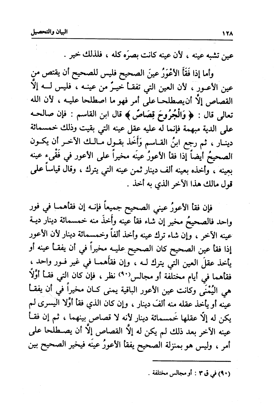 وأما إذا فقأ الأعور عين الصحيح فليس للصحيح أن يقتص من عين الأعور؛ لأن العين التي تفقأ خير من عينه، فليس له إلا القصاص إلا أن يصطلحا على أمر فهو ما اصطلحا عليه؛ لأن الله تعالى قال: {وَالْجُرُوحَ قِصَاصٌ} [المائدة: 45] قال ابن القاسم: فإن صالحه على الدية مبهمة فإنما له عليه عقل عينه التي بقيت وذلك خمسمائة دينار، ثم رجع ابن القاسم وأخذ بقول مالك الآخر أن يكون الصحيح أيضا إذا فقأ الأعور عينه مخيرا على الأعور في فقئ عينه بعينه، وأخذه بعينه ألف دينار ثمن عينه التي يترك، وقال قياسا على قول مالك هذا الآخر الذي به أخذ.