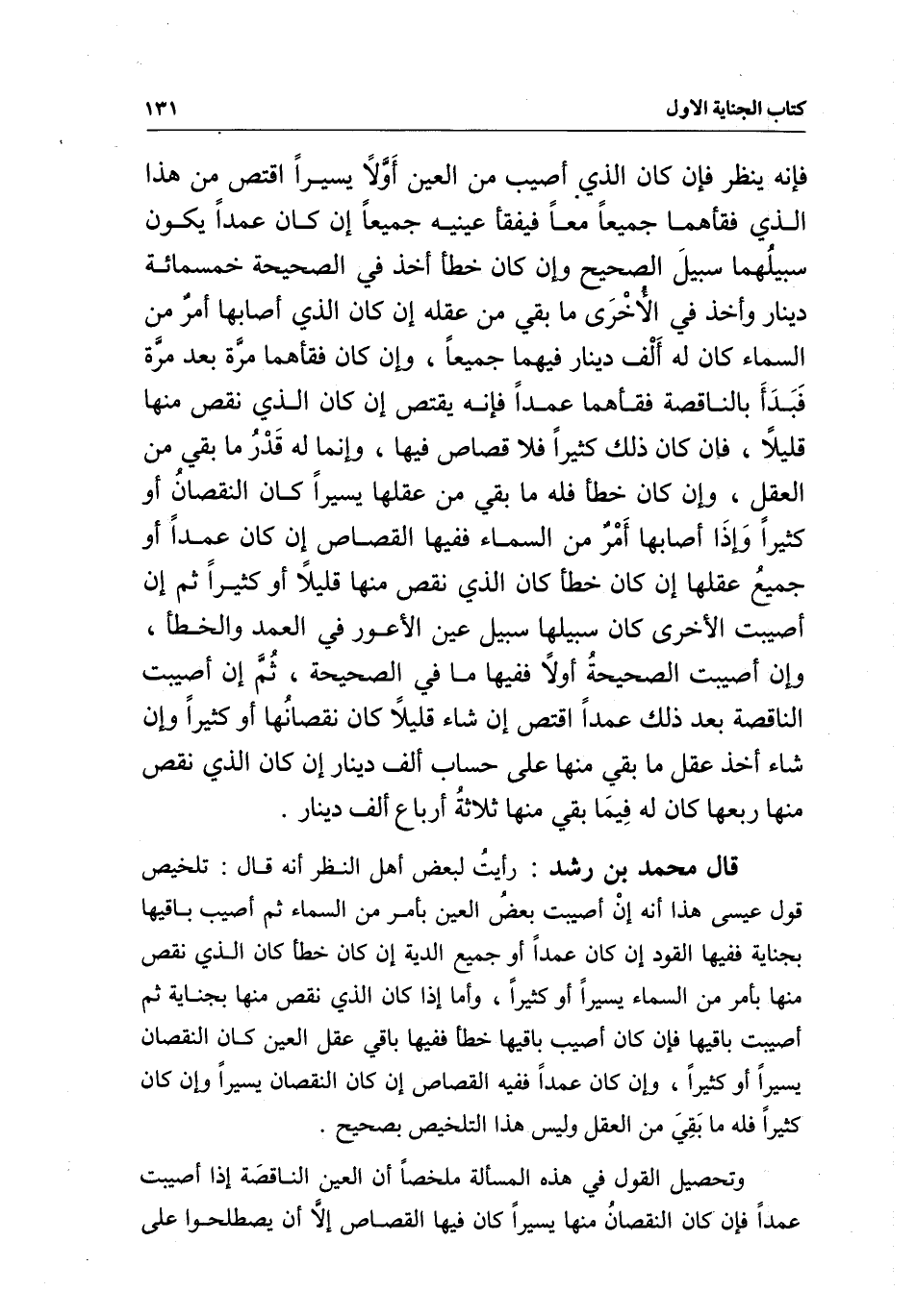 قال محمد بن رشد: رأيت لبعض أهل النظر أنه قال: تلخيص قول عيسى هذا أنه إن أصيبت بعض العين بأمر من السماء ثم أصيب باقيها بجناية ففيها القود إن كان عمدا أو جميع الدية إن كان خطأ كان الذي نقص منها بأمر من السماء يسيرا أو كثيرا، وأما إذا كان الذي نقص منها بجناية ثم أصيبت باقيها فإن كان أصيب باقيها خطأ ففيها باقي عقل العين كان النقصان يسيرا أو كثيرا، وإن كان عمدا ففيه القصاص إن كان النقصان يسيرا وإن كان كثيرا فله ما بقي من العقل وليس هذا التلخيص بصحيح.