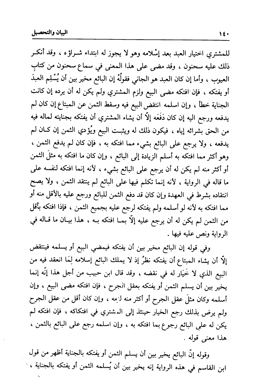 للمشتري اختيار العبد بعد إسلامه وهو لا يجوز له ابتداء شراؤه، وقد أنكر ذلك عليه سحنون، وقد مضى على هذا المعنى في سماع سحنون من كتاب العيوب، وأما إن كان العبد هو الجاني فقوله إن البائع مخير بين أن يسلم العبد أو يفتكه، فإن أفتكه مضى البيع ولزم المشتري ولم يكن له أن يرده إن كانت الجناية خطأ، وإن أسلمه انتقض البيع فيه وسقط الثمن عن المبتاع إن كان لم يدفعه ورجع إليه إن كان دفعه إلا أن يشاء المشتري أن يفتكه بجنايته لماله فيه من الحق بشرائه إياه، فيكون ذلك له ويثبت البيع ويؤدي الثمن إن كان لم يدفعه، ولا يرجع على البائع بشيء مما أفتكه به، فإن كان لم يدفع الثمن، وهو أكثر مما أفتكه به أسلم الزيادة إلى البائع، وإن كان ما أفتكه به مثل الثمن أو أكثر منه لم يكن له أن يرجع على البائع بشيء؛ لأنه إنما أفتكه لنفسه على ما قاله في الرواية؛ لأنه إنما تكلم فيها على البائع لم ينتقد الثمن، ولا يصح انتقاده بشرط في العهدة وإن كان قد دفع الثمن للبائع ورجع عليه بالأقل منه أو مما أفتكه به لأنه لو أسلمه ولم يفتكه لرجع عليه بجميع الثمن، فإذا أفتكه بأقل من الثمن لم يكن له أن يرجع عليه إلا بما أفتكه به، هذا بيان ما قاله في الرواية ونص عليه فيها.