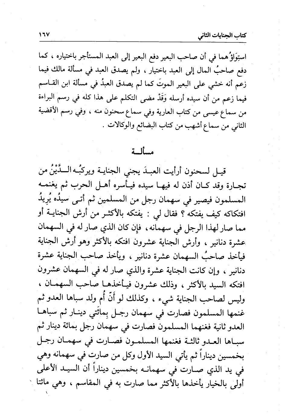 مسألة قيل لسحنون أرأيت العبد يجني الجناية ويركبه الدين من تجارة وقد كان أذن له فيها سيده فيأسره أهل الحرب ثم يغنمه المسلمون فيصير في سهمان رجل من المسلمين ثم أتى سيده يريد افتكاكه كيف يفتكه؟ فقال لي: يفتكه بالأكثر من أرش الجناية أو مما صار لهذا الرجل في سهمانه، فإن كان الذي صار له في السهمان عشرة دنانير، وأرش الجناية عشرون أفتكه بالأكثر وهو أرش الجناية فيأخذ صاحب السهمان عشرة دنانير، ويأخذ صاحب الجناية عشرة دنانير، وإن كانت الجناية عشرة والذي صار له في السهمان عشرون أفتكه السيد بالأكثر، وذلك عشرون فيأخذها صاحب السهمان، وليس لصاحب الجناية شيء، وكذلك لو أن أم ولده سباها العدو ثم غنمها المسلمون فصارت في سهمان رجل بمائتي دينار ثم سباها العدو ثانية فغنهما المسلمون فصارت في سهمان رجل بمائة دينار ثم سباها العدو ثالثة فغنمها المسلمون فصارت في سهمان رجل بخمسين دينارا ثم يأتي السيد الأول وكل من صارت في سهمانه وهي في يد الذي صارت في سهمانه بخمسين دينارا أن السيد الأعلى أولى بالخيار يأخذها بالأكثر مما صارت به في المقاسم، وهي مائتا