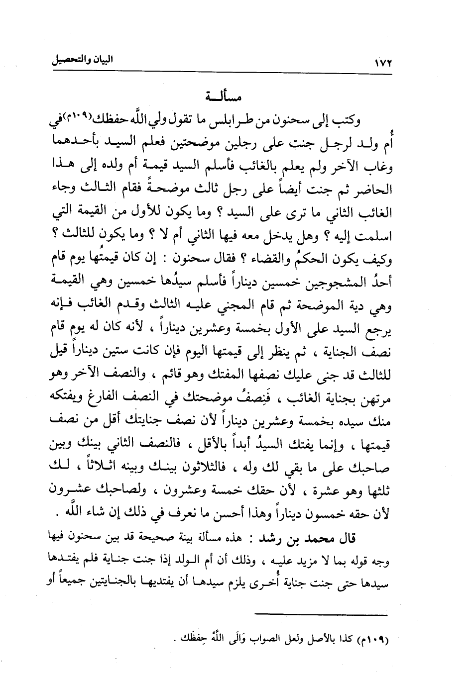 مسألة وكتب إلى سحنون من طرابلس ما تقول ولي الله حفظك في أم ولد لرجل جنت على رجلين موضحتين فعلم السيد بأحدهما وغاب الآخر ولم يعلم بالغائب فأسلم السيد قيمة أم ولده إلى هذا الحاضر ثم جنت أيضا على رجل ثالث موضحة فقام الثالث وجاء الغائب الثاني ما ترى على السيد؟ وما يكون للأول من القيمة التي أسلمت إليه؟ وهل يدخل معه فيها الثاني أم لا؟ وما يكون للثالث؟ وكيف يكون الحكم والقضاء؟ فقال سحنون: إن كان قيمتها يوم قام أحد المشجوجين خمسين دينارا فأسلم سيدها خمسين وهي القيمة وهي دية الموضحة ثم قام المجني عليه الثالث وقدم الغائب فإنه يرجع السيد على الأول بخمسة وعشرين دينارا؛ لأنه كان له يوم قام نصف الجناية، ثم ينظر إلى قيمتها اليوم فإن كانت ستين دينارا قيل للثالث قد جنى عليك نصفها المفتك وهو قائم، والنصف الآخر وهو مرتهن بجناية الغائب، فنصف موضحتك في النصف الفارغ ويفتكه منك سيده بخمسة وعشرين دينارا لأن نصف جنايتك أقل من نصف قيمتها، وإنما يفتك السيد أبدا بالأقل، فالنصف الثاني بينك وبين صاحبك على ما بقي لك وله، فالثلاثون بينك وبينه أثلاثا، لك ثلثها وهو عشرة؛ لأن حقك خمسة وعشرون، ولصاحبك عشرون لأن حقه خمسون دينارا وهذا أحسن ما نعرف في ذلك إن شاء الله.