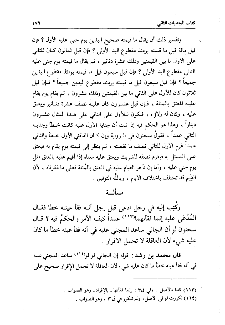 وتفسير ذلك أن يقال ما قيمته صحيح اليدين يوم جنى عليه الأول؟ فإن قيل مائة قيل ما قيمته يومئذ مقطوع اليد الأولى؟ فإن قيل ثمانون كان للثاني على الأول ما بين القيمتين وذلك عشرة دنانير، ثم يقال ما قيمته يوم جنى عليه الثاني مقطوع اليد الأولى؟ فإن قيل سبعون قيل ما قيمته يومئذ مقطوع اليدين جميعا؟ فإن قيل سبعون قيل ما قيمته يومئذ مقطوع اليدين جميعا؟ فإن قيل ثلاثون كان للأول على الثاني ما بين القيمتين وذلك عشرون، ثم يقام يوم يقام عليه للعتق بالمثلة، فإن قيل عشرون كان عليه نصف عشرة دنانير ويعتق عليه، وكان له ولاؤه، فيكون للأول على الثاني على هذا المثال عشرون دينارا، وهذا هو الحكم فيه إذا ثبت أن جناية الأول عليه كانت خطأ وجناية الثاني عمدا، فقول سحنون في الرواية وإن كان الفاقيء الأول خطأ والثاني عمدا غرم الأول للثاني نصف ما نقصته، ثم ينظر إلى قيمته يوم يقام به فيعتق على الممثل به فيغرم نصفه للشريك ويعتق عليه معناه إذا أقيم عليه بالعتق مثل يوم جني عليه، وأما إن تأخر القيام عليه في العتق بالمثلة فعلى ما ذكرناه؛ لأن القيم قد تختلف باختلاف الأيام، وبالله التوفيق.