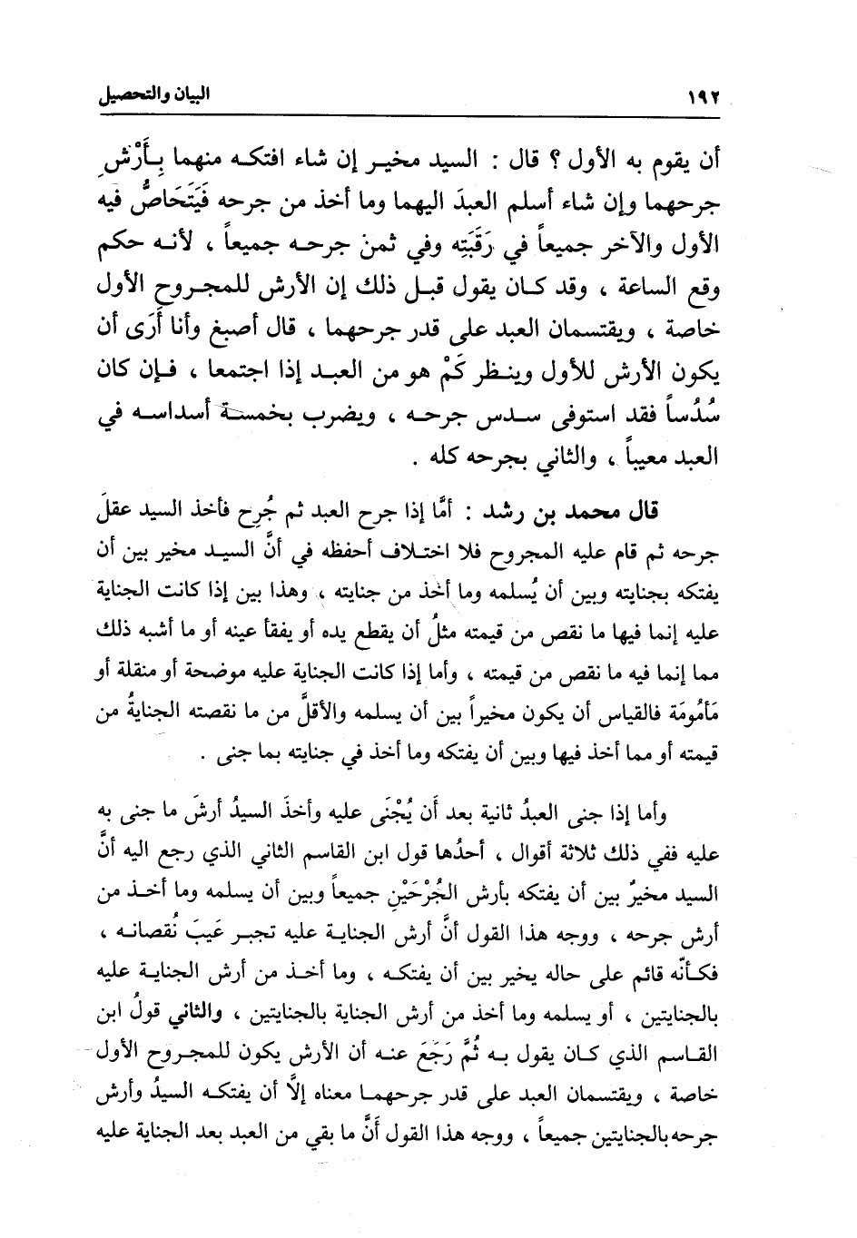 قال محمد بن رشد: أما إذا جرح العبد ثم جرح فأخذ السيد عقل جرحه ثم قام عليه المجروح فلا اختلاف أحفظه في أن السيد مخير بين أن يفتكه بجنايته وبين أن يسلمه وما أخذ من جنايته، وهذا بين إذا كانت الجناية عليه إنما فيها ما نقص من قيمته مثل أن يقطع يده أو يفقأ عينه أو ما أشبه ذلك مما إنما فيه ما نقص من قيمته، وأما إذا كانت الجناية عليه موضحة أو منقلة أو مأمومة فالقياس أن يكون مخيرا بين أن يسلمه والأقل من ما نقصته الجناية من قيمته أو مما أخذ فيها وبين أن يفتكه وما أخذ في جنايته بما جنى.