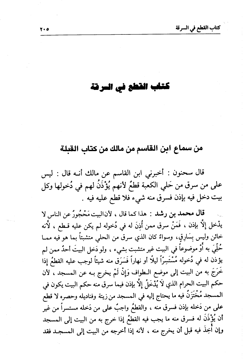 من سماع ابن القاسم من مالك من كتاب القبلة قال سحنون: أخبرني ابن القاسم عن مالك أنه قال: ليس على من سرق من حلي الكعبة قطع لأنهم يؤذن لهم في دخولها وكل بيت دخل فيه بإذن فسرق منه شيء فلا قطع عليه فيه.