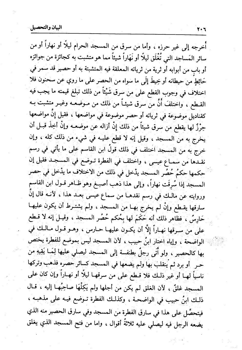 أخرجه إلى غير حرزه، وأما من سرق من المسجد الحرام ليلا أو نهارا أو من سائر المساجد التي تغلق ليلا أو نهارا شيئا مما هو متشبت به كجائزة من جوائزه أو باب من أبوابه أو ثرية من ثرياته المعلقة فيه المتشبتة به أو حصير قد سمر في حائط من حيطانه أو خيط إلى ما سواه من الحصر على ما روي عن سحنون فلا اختلاف في وجوب القطع على من سرق شيئا من ذلك تبلغ قيمته ما يجب فيه القطع، واختلف أن من سرق شيئا من ذلك من موضعه وغير متشبت به كقناديل موضوعة في ثرياته أو حصر موضوعة في مواضعها، فقيل إن مواضعها حرز لها يقطع من سرق شيئا من ذلك إن أزاله عن موضعه وإن أخذ قبل أن يخرج به من المسجد، وقيل إنه لا قطع عليه في شيء من ذلك كله، وإن خرج به من المسجد اختلف في ذلك قول ابن القاسم على ما يأتي في رسم نقدها من سماع عيسى، واختلف في الفطرة توضع في المسجد فقيل إن حكمها حكم حصر المسجد يدخل في ذلك من الاختلاف ما يدخل في حصر المسجد إذا سرقت نهارا، وإلى هذا ذهب أصبغ وهو ظاهر قول ابن القاسم وروايته عن مالك في رسم نقدها من سماع عيسى بعد هذا؛ لأنه قال إن سارقها يقطع وإن لم يخرج بها من المسجد، ولم يشترط أن يكون عليها حارس، فظاهر ذلك أنه حكم لها بحكم حصر المسجد، وقيل إنه لا قطع على من سرقها نهارا إلا أن يكون عليها حارس، وهو قول مالك في الواضحة، وإياه اختار ابن حبيب؛ لأن المسجد ليس بموضع للفطرة يختص بها كالحصير، ولو أتى رجل بطنفسة إلى المسجد ليصلي عليها لما يقيه من حر أو برد ثم ينقلب بها ولم يضعها في المسجد كسائر حصره فذهب وتركها ناسيا لها أو غير ذلك فلا قطع على من سرقها ليلا أو نهارا وإن كان على المسجد غلق؛ لأن الغلق لم يكن من أجلها ولم يكلها صاحبها إليه، قال ذلك ابن حبيب في الواضحة، وكذلك الفطرة توضع فيه على مذهبه، فيتحصل على هذا في سارق الفطرة من المسجد وفي سارق الحصير منه الذي يضعه الرجل فيه ليصلي عليه ثلاثة أقوال، وأما من فتح المسجد الذي يغلق