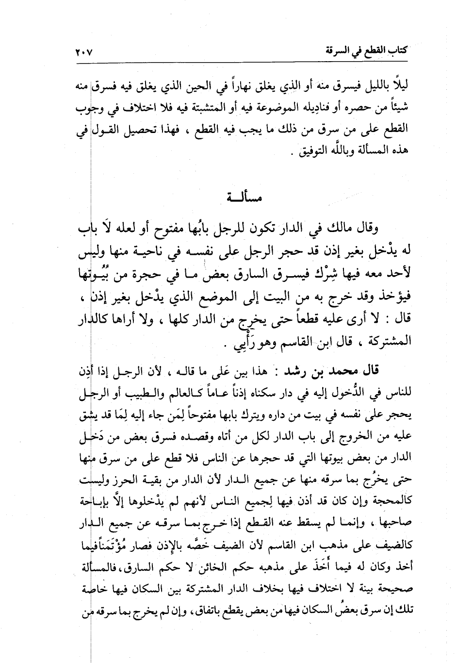 مسألة وقال مالك في الدار تكون للرجل بابها مفتوح أو لعله لا باب له يدخل بغير إذن قد حجر الرجل على نفسه في ناحية منها وليس لأحد معه فيها شرك فيسرق السارق بعض ما في حجرة من بيوتها فيؤخذ وقد خرج به من البيت إلى الموضع الذي يدخل بغير إذن، قال: لا أرى عليه قطعا حتى يخرج من الدار كلها، ولا أراها كالدار المشتركة، قال ابن القاسم وهو رأيي.