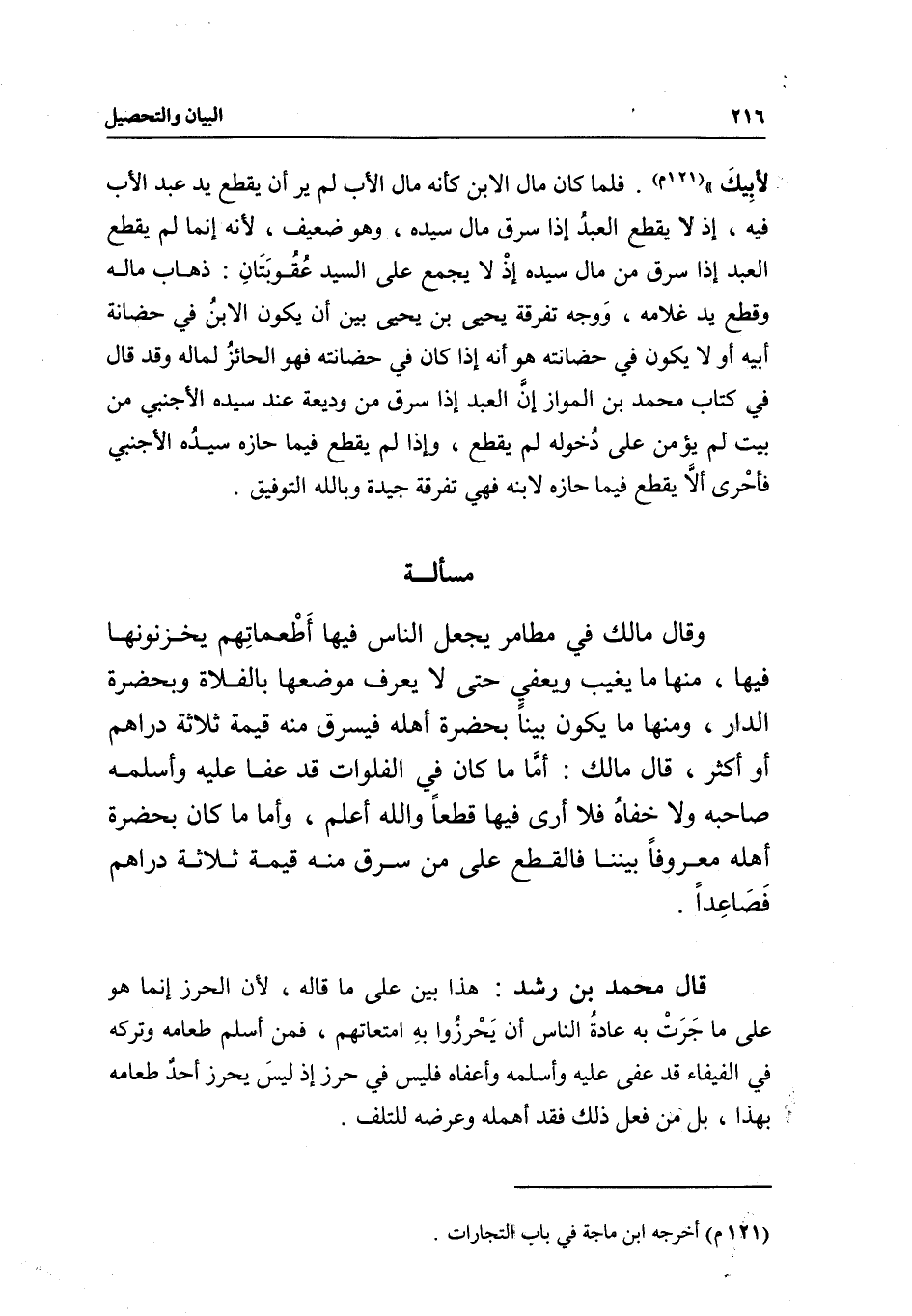 قال محمد بن رشد: هذا بين على ما قاله؛ لأن الحرز إنما هو على ما جرت به عادة الناس أن يحرزوا به امتعاتهم، فمن أسلم طعامه وتركه في الفيفاء قد عفى عليه وأسلمه وأعفاه فليس في حرز إذ ليس يحرز أحد طعامه بهذا، بل من فعل ذلك فقد أهمله وعرضه للتلف.
