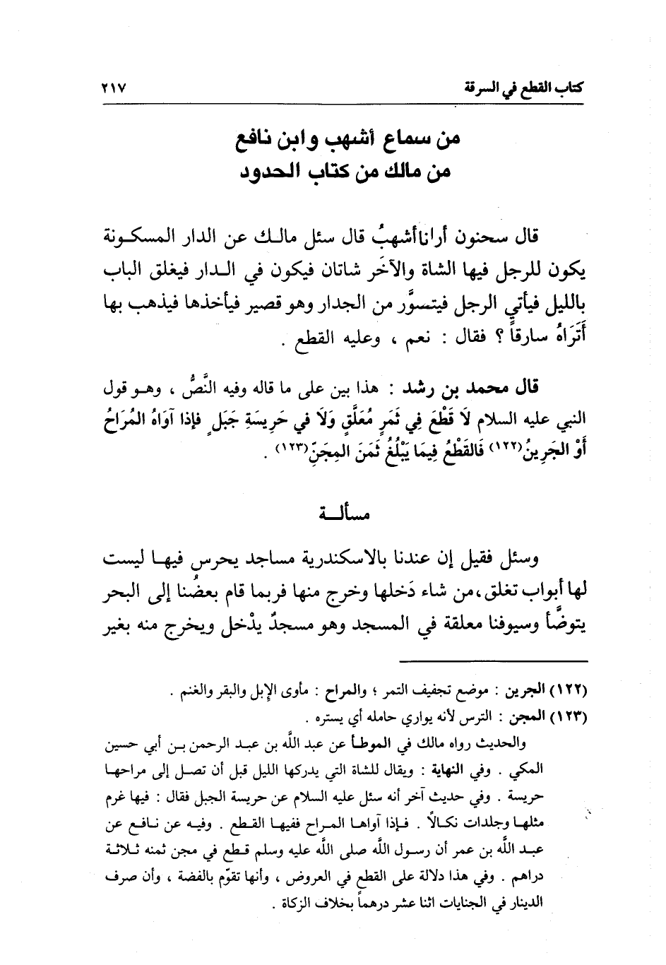 من سماع أشهب وابن نافع من مالك من كتاب الحدود قال سحنون أرانا أشهب قال سئل مالك عن الدار المسكونة يكون للرجل فيها الشاة والآخر شاتان فيكون في الدار فيغلق الباب بالليل فيأتي الرجل فيتسور من الجدار وهو قصير فيأخذها فيذهب بها أتراه سارقا؟ فقال: نعم، وعليه القطع.
