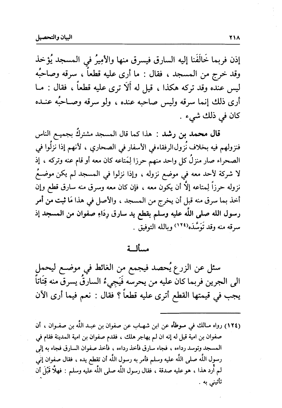 قال محمد بن رشد: هذا كما قال المسجد مشترك بجميع الناس فنزولهم فيه بخلاف نزول الرفقاء في الأسفار في الصحاري؛ لأنهم إذا نزلوا في الصحراء صار منزل كل واحد منهم حرزا لمتاعه كان معه أو قام عنه وتركه، إذ لا شركة لأحد معه في موضع نزوله، وإذا نزلوا في المسجد لم يكن موضع نزوله حرزا لمتاعه إلا أن يكون معه، فإن كان معه وسرق منه سارق قطع وإن أخذ بما سرق منه قبل أن يخرج من المسجد، والأصل في هذا ما ثبت من أمر رسول الله - صَلَّى اللَّهُ عَلَيْهِ وَسَلَّمَ - بقطع يد سارق رداء صفوان من المسجد إذ سرقه منه وقد توسده وبالله التوفيق.