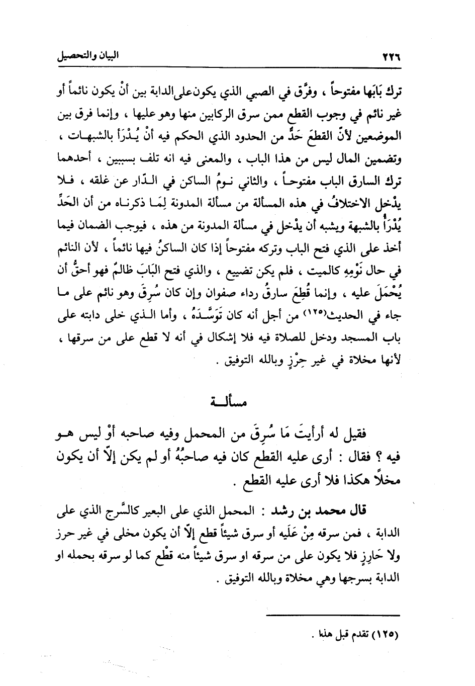 ترك بابها مفتوحا، وفرق في الصبي الذي يكون على الدابة بين أن يكون نائما أو غير نائم في وجوب القطع ممن سرق الركابين منها وهو عليها، وإنما فرق بين الموضعين لأن القطع حد من الحدود الذي الحكم فيه أن يدرأ بالشبهات، وتضمين المال ليس من هذا الباب، والمعنى فيه أنه تلف بسببين، أحدهما ترك السارق الباب مفتوحا، والثاني نوم الساكن في الدار عن غلقه، فلا يدخل الاختلاف في هذه المسألة من مسألة المدونة لما ذكرناه من أن الحد يدرأ بالشبهة ويشبه أن يدخل في مسألة المدونة من هذه، فيوجب الضمان فيما أخذ على الذي فتح الباب وتركه مفتوحا إذا كان الساكن فيها نائما؛ لأن النائم في حال نومه كالميت، فلم يكن تضييع، والذي فتح الباب ظالم فهو أحق أن يحمل عليه، وإنما قطع سارق رداء صفوان وإن كان سرق وهو نائم على ما جاء في الحديث من أجل أنه كان توسده، وأما الذي خلى دابته على باب المسجد ودخل للصلاة فيه فلا إشكال في أنه لا قطع على من سرقها؛ لأنها مخلاة في غير حرز وبالله التوفيق.