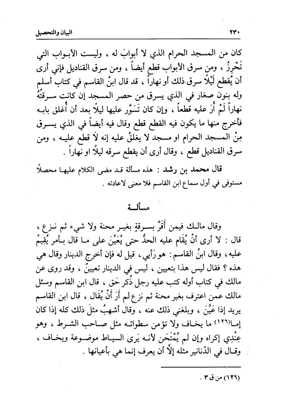 كان من المسجد الحرام الذي لا أبواب له، وليست الأبواب التي تحرز، ومن سرق الأبواب قطع أيضا، ومن سرق القناديل فإني أرى أن يقطع ليلا سرق ذلك أو نهارا، قد قال ابن القاسم في كتاب أسلم وله بنون صغار في الذي يسرق من حصر المسجد إن كانت سرقته نهارا لم أر عليه قطعا، وإن كان تسور عليها ليلا بعد أن أغلق بابه فأخرج منها ما يكون فيه القطع قطع وقال فيه أيضا في الذي يسرق من المسجد الحرام أو مسجد لا يغلق عليه إنه لا قطع عليه، ومن سرق القناديل قطع، وقال أرى أن يقطع سرقه ليلا أو نهارا.