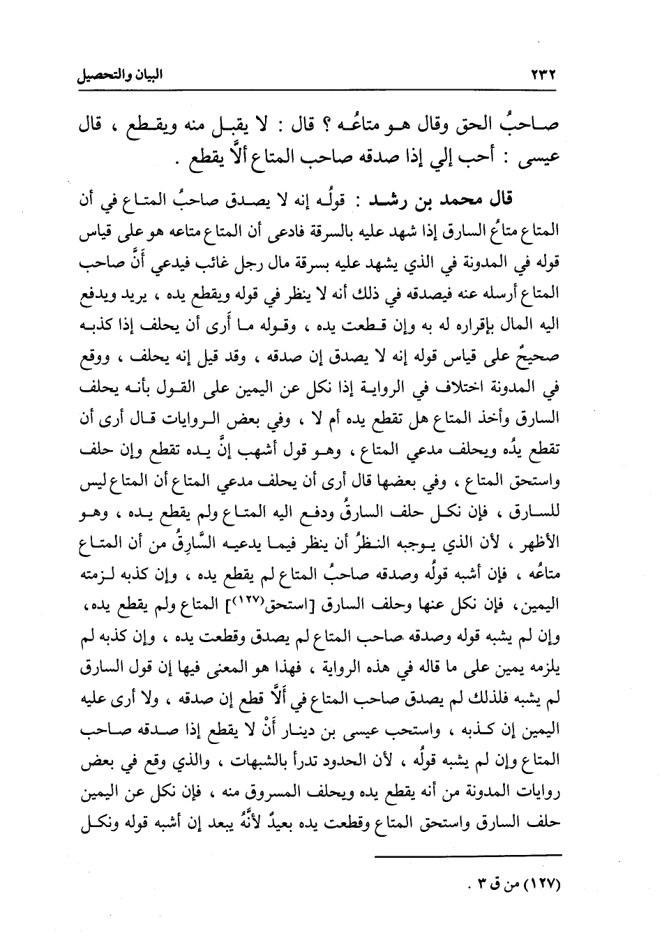 قال محمد بن رشد: قوله إنه لا يصدق صاحب المتاع في أن المتاع متاع السارق إذا شهد عليه بالسرقة فادعى أن المتاع متاعه هو على قياس قوله في المدونة في الذي يشهد عليه بسرقة مال رجل غائب فيدعي أن صاحب المتاع أرسله عنه فيصدقه في ذلك أنه لا ينظر في قوله ويقطع يده، يريد ويدفع إليه المال بإقراره له به وإن قطعت يده، وقوله ما أرى أن يحلف إذا كذبه صحيح على قياس قوله إنه لا يصدق إن صدقه، وقد قيل إنه يحلف، ووقع في المدونة اختلاف في الرواية إذا نكل عن اليمين على القول بأنه يحلف السارق وأخذ المتاع هل تقطع يده أم لا، وفي بعض الروايات قال أرى أن تقطع يده ويحلف مدعي المتاع، وهو قول أشهب إن يده تقطع وإن حلف واستحق المتاع، وفي بعضها قال أرى أن يحلف مدعي المتاع أن المتاع ليس للسارق، فإن نكل حلف السارق ودفع إليه المتاع ولم يقطع يده، وهو الأظهر؛ لأن الذي يوجبه النظر أن ينظر فيما يدعيه السارق من أن المتاع متاعه، فإن أشبه قوله وصدقه صاحب المتاع لم يقطع يده، وإن كذبه لزمته اليمين، فإن نكل عنها وحلف السارق [استحق] ، المتاع ولم يقطع يده، وإن لم يشبه قوله وصدقه صاحب المتاع لم يصدق وقطعت يده، وإن كذبه لم يلزمه يمين على ما قاله في هذه الرواية، فهذا هو المعنى فيها إن قول السارق لم يشبه فلذلك لم يصدق صاحب المتاع في ألا قطع إن صدقه، ولا أرى عليه اليمين إن كذبه، واستحب عيسى بن دينار أن لا يقطع إذا صدقه صاحب المتاع وإن لم يشبه قوله؛ لأن الحدود تدرأ بالشبهات، والذي وقع في بعض روايات المدونة من أنه يقطع يده ويحلف المسروق منه، فإن نكل عن اليمين حلف السارق واستحق المتاع وقطعت يده بعيد لأنه يبعد إن أشبه قوله ونكل