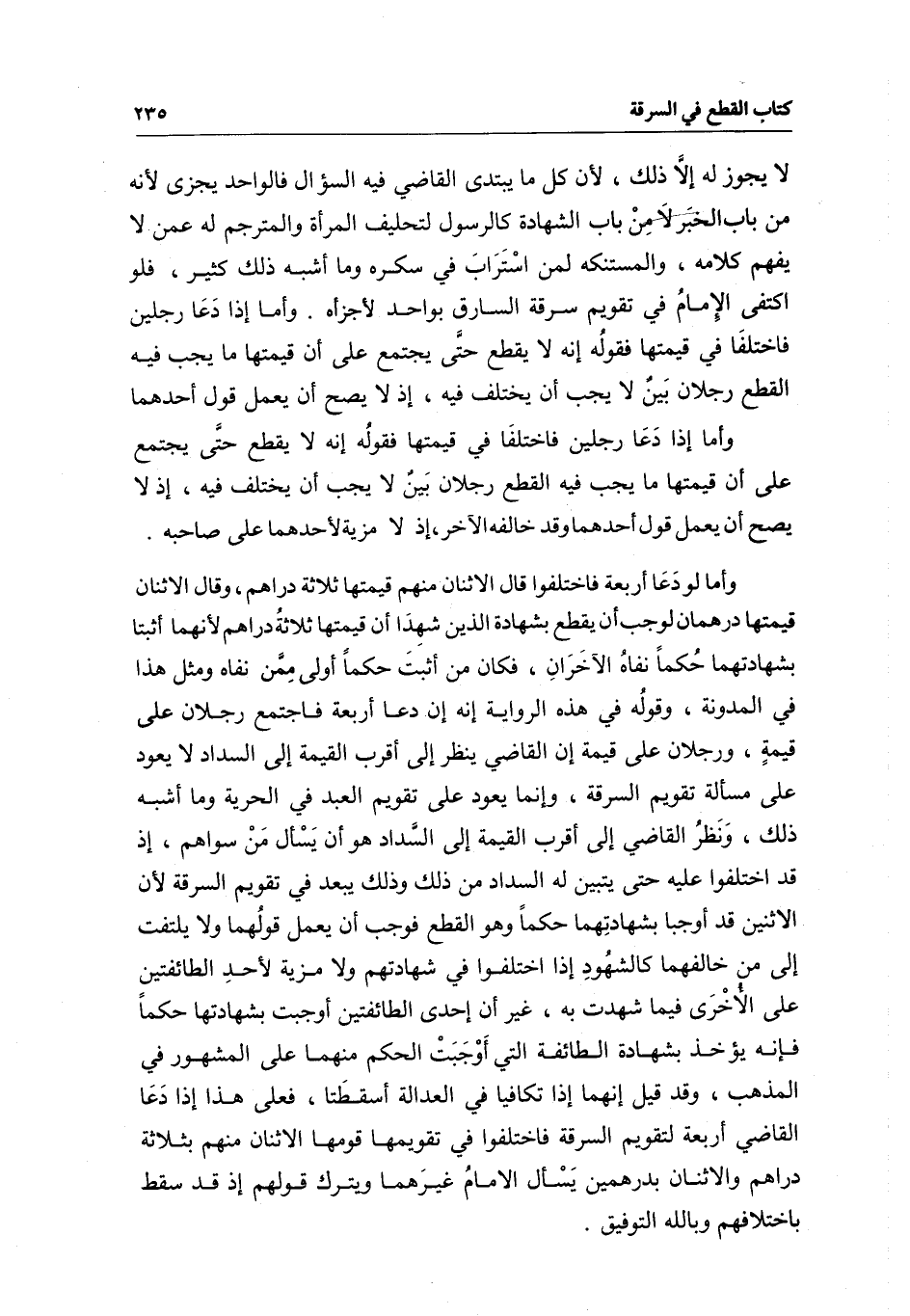 وأما لو دعا أربعة فاختلفوا قال الاثنان منهم قيمتها ثلاثة دراهم، وقال الاثنان قيمتها درهمان لوجب أن يقطع بشهادة اللذين شهدا أن قيمتها ثلاثة دراهم لأنهما أثبتا بشهادتهما حكما نفاه الآخران، فكان من أثبت حكما أولى ممن نفاه ومثل هذا في المدونة، وقوله في هذه الرواية إنه إن دعا أربعة فاجتمع رجلان على قيمة، ورجلان على قيمة إن القاضي ينظر إلى أقرب القيمة إلى السداد لا يعود على مسألة تقويم السرقة، وإنما يعود على تقويم العبد في الحرية وما أشبه ذلك، ونظر القاضي إلى أقرب القيمة إلى السداد هو أن يسأل من سواهم، إذ قد اختلفوا عليه حتى يتبين له السداد من ذلك وذلك يبعد في تقويم السرقة لأن الاثنين قد أوجبا بشهادتهما حكما وهو القطع فوجب أن يعمل قولهما ولا يلتفت إلى من خالفهما كالشهود إذا اختلفوا في شهادتهم ولا مزية لأحد الطائفتين على الأخرى فيما شهدت به، غير أن إحدى الطائفتين أوجبت بشهادتها حكما فإنه يؤخذ بشهادة الطائفة التي أوجبت الحكم منهما على المشهور في المذهب، وقد قيل إنهما إذا تكافيا في العدالة أسقطتا، فعلى هذا إذا دعا القاضي أربعة لتقويم السرقة فاختلفوا في تقويمها قومها الاثنان منهم بثلاثة دراهم والاثنان بدرهمين يسأل الإمام غيرهما ويترك قولهم إذ قد سقط باختلافهم وبالله التوفيق.
