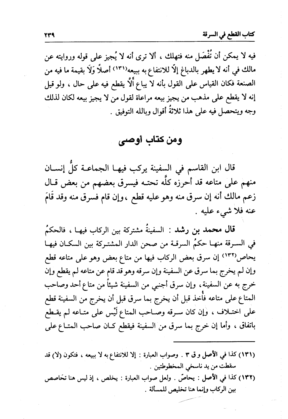 ومن كتاب أوصى قال ابن القاسم في السفينة يركب فيها الجماعة كل إنسان منهم على متاعه قد أحرزه كله تحته فيسرق بعضهم من بعض قال زعم مالك أنه إن سرق منه وهو عليه قطع، وإن قام فسرق منه وقد قام عنه فلا شيء عليه.