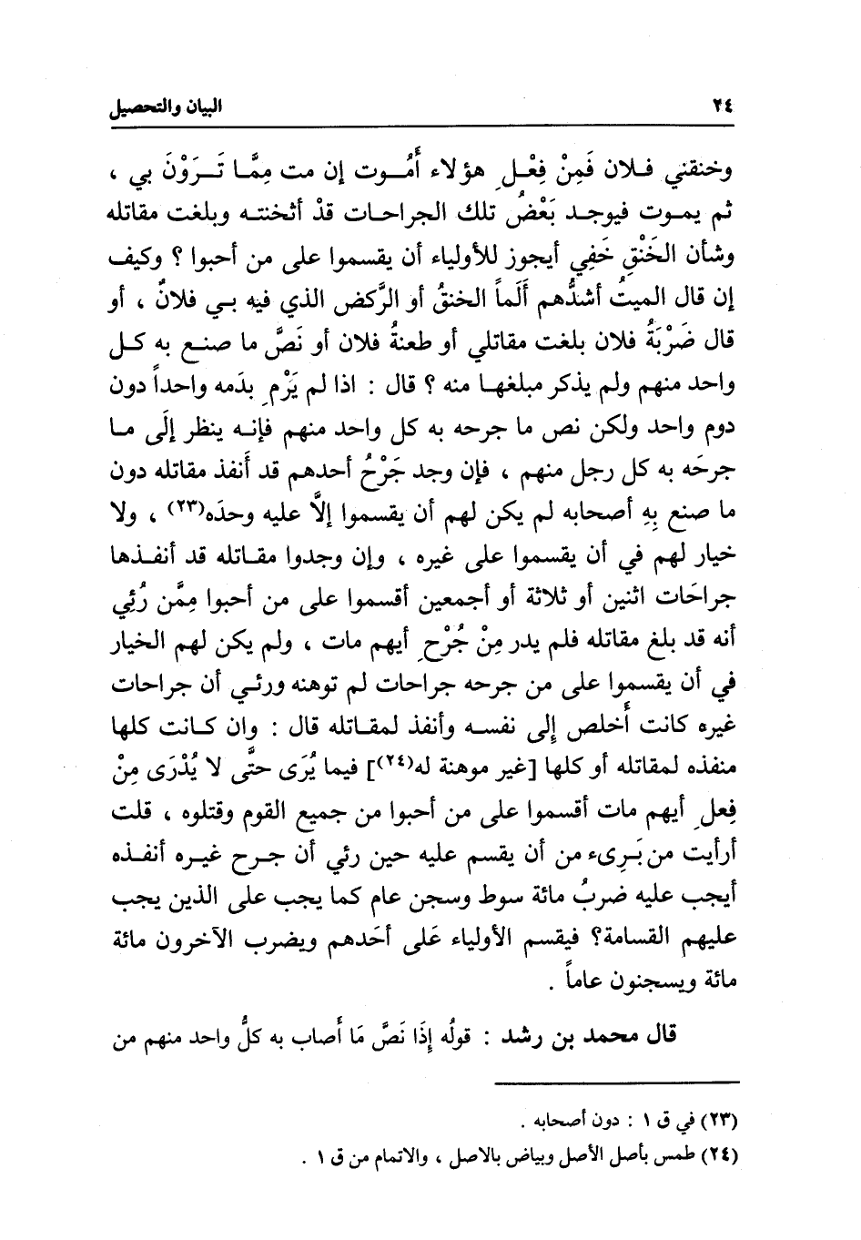 وخنقني فلان فمن فعل هؤلاء أموت إن مت مما ترون بي، ثم يموت فيوجد بعض تلك الجراحات قد أثخنته وبلغت مقاتله وشأن الخنق خفي أيجوز للأولياء أن يقسموا على من أحبوا؟ وكيف إن قال الميت أشدهم ألما الخنق أو الركض الذي فيه بي فلان، أو قال ضربة فلان بلغت مقاتلي أو طعنة فلان أو نص ما صنع به كل واحد منهم ولم يذكر مبلغها منه؟ قال: إذا لم يرم بدمه واحدا دون دوم واحد ولكن نص ما جرحه به كل واحد منهم فإنه ينظر إلى ما جرحه به كل رجل منهم، فإن وجد جرح أحدهم قد أنفذ مقاتله دون ما صنع به أصحابه لم يكن لهم أن يقسموا إلا عليه وحده، ولا خيار لهم في أن يقسموا على غيره، وإن وجدوا مقاتله قد أنفذها جراحات اثنين أو ثلاثة أو أجمعين أقسموا على من أحبوا ممن رئي أنه قد بلغ مقاتله فلم يدر من جرح أيهم مات، ولم يكن لهم الخيار في أن يقسموا على من جرحه جراحات لم توهنه ورئي أن جراحات غيره كانت أخلص إلى نفسه وأنفذ لمقاتله قال: وإن كانت كلها منفذه لمقاتله أو كلها [غير موهنة له] فيما يرى حتى لا يدرى من فعل أيهم مات أقسموا على من أحبوا من جميع القوم وقتلوه، قلت: أرأيت من برئ من أن يقسم عليه حين رئي أن جرح غيره أنفذه أيجب عليه ضرب مائة سوط وسجن عام كما يجب على الذين يجب عليهم القسامة؟ فيقسم الأولياء على أحدهم ويضرب الآخرون مائة مائة ويسجنون عاما.