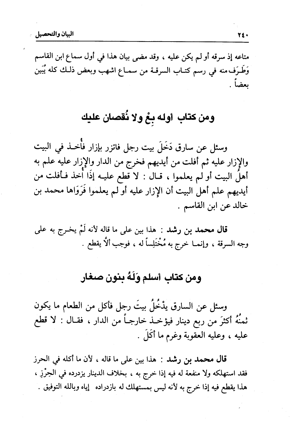 ومن كتاب أوله بع ولا نقصان عليك وسئل عن سارق دخل بيت رجل فاتزر بإزار فأخذ في البيت والإزار عليه ثم أفلت من أيديهم فخرج من الدار والإزار عليه علم به أهل البيت أو لم يعلموا، قال: لا قطع عليه إذا أخذ فأفلت من أيديهم علم أهل البيت أن الإزار عليه أو لم يعلموا فرواها محمد بن خالد عن ابن القاسم.