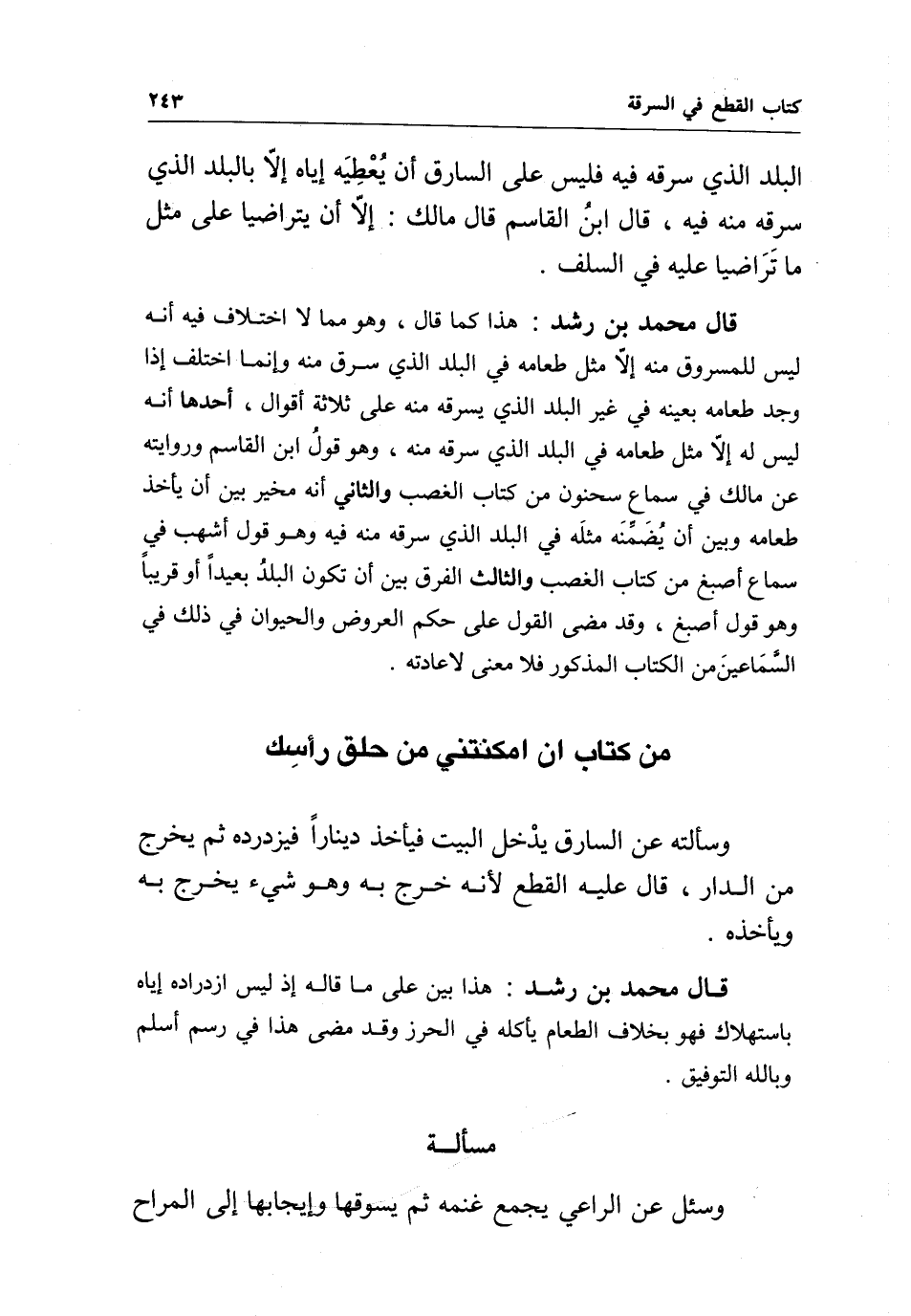 من كتاب إن أمكنتني من حلق رأسك وسألته عن السارق يدخل البيت فيأخذ دينارا فيزدرده ثم يخرج من الدار، قال عليه القطع؛ لأنه خرج به وهو شيء يخرج به ويأخذه.
