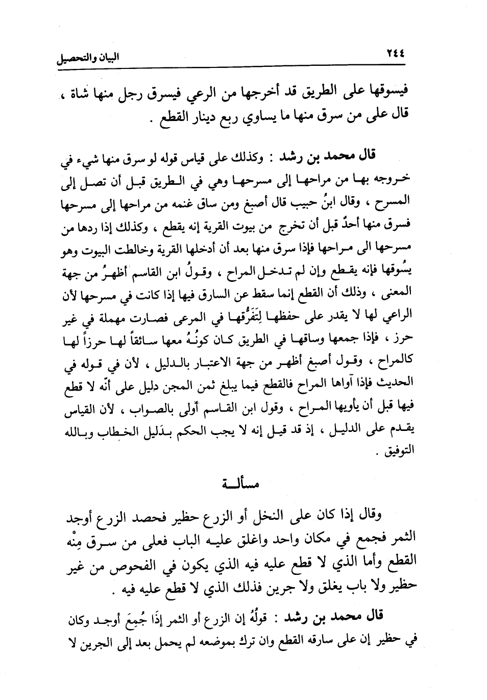 قال محمد بن رشد: وكذلك على قياس قوله لو سرق منها شيء في خروجه بها من مراحها إلى مسرحها، وهي في الطريق قبل أن تصل إلى المسرح، وقال ابن حبيب قال أصبغ ومن ساق غنمه من مراحها إلى مسرحها فسرق منها أحد قبل أن تخرج من بيوت القرية إنه يقطع، وكذلك إذا ردها من مسرحها إلى مراحها فإذا سرق منها بعد أن أدخلها القرية وخالطت البيوت وهو يسوقها فإنه يقطع وإن لم تدخل المراح، وقول ابن القاسم أظهر من جهة المعنى، وذلك أن القطع إنما سقط عن السارق فيها إذا كانت في مسرحها؛ لأن الراعي لها لا يقدر على حفظها؛ لتفرقها في المرعى فصارت مهملة في غير حرز، فإذا جمعها وساقها في الطريق كان كونه معها سائقا لها حرزا لها كالمراح، وقول أصبغ أظهر من جهة الاعتبار بالدليل؛ لأن في قوله في الحديث فإذا آواها المراح فالقطع فيما يبلغ ثمن المجن دليل على أنه لا قطع فيها قبل أن يأويها المراح، وقول ابن القاسم أولى بالصواب؛ لأن القياس يقدم على الدليل، إذ قد قيل إنه لا يجب الحكم بدليل الخطاب وبالله التوفيق.