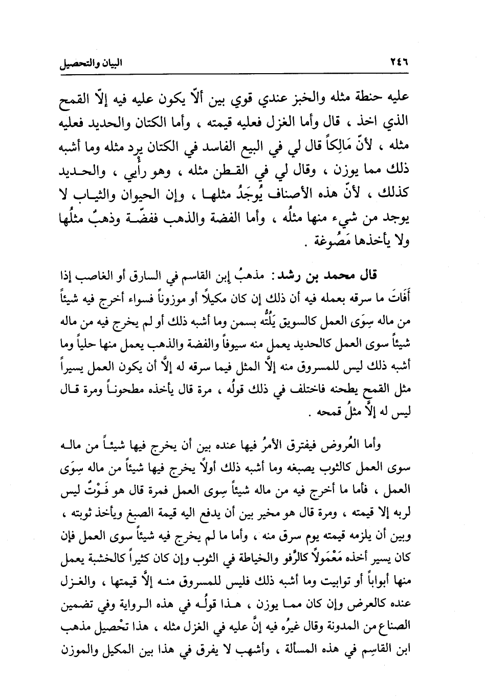 عليه حنطة مثله والخبز عندي قوي بين ألا يكون عليه فيه إلا القمح الذي أخذ، قال وأما الغزل فعليه قيمته، وأما الكتان والحديد فعليه مثله؛ لأن مالكا قال لي في البيع الفاسد في الكتان يرد مثله وما أشبه ذلك مما يوزن، وقال لي في القطن مثله، وهو رأيي، والحديد كذلك؛ لأن هذه الأصناف يوجد مثلها، وإن الحيوان والثياب لا يوجد من شيء منها مثله، وأما الفضة والذهب ففضة وذهب مثلها ولا يأخذها مصوغة.