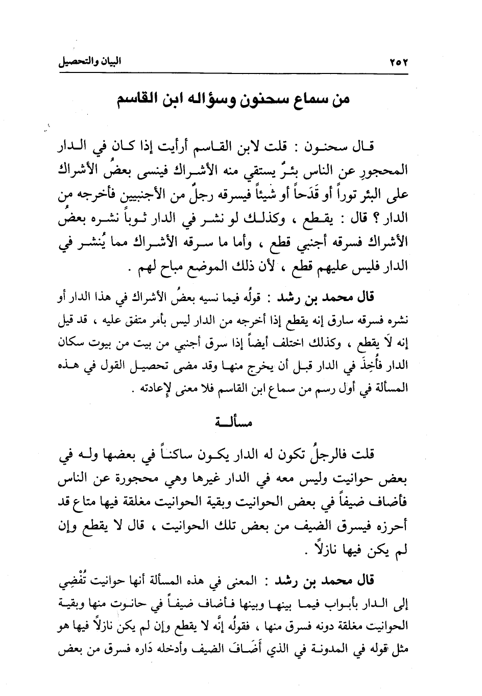 من سماع سحنون وسؤاله ابن القاسم قال سحنون: قلت لابن القاسم أرأيت إذا كان في الدار المحجور عن الناس بئر يستقي منه الأشراك فينسى بعض الأشراك على البئر تورا أو قدحا أو شيئا فيسرقه رجل من الأجنبيين فأخرجه من الدار؟ قال: يقطع، وكذلك لو نشر في الدار ثوبا نشره بعض الأشراك فسرقه أجنبي قطع، وأما ما سرقه الأشراك مما ينشر في الدار فليس عليهم قطع؛ لأن ذلك الموضع مباح لهم.