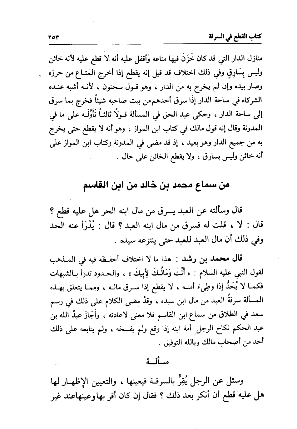 من سماع محمد بن خالد من ابن القاسم قال وسألته عن العبد يسرق من مال ابنه الحر هل عليه قطع؟ قال: لا، قلت له فسرق من مال ابنه العبد؟ قال: يدرأ عنه الحد وفي ذلك أن مال العبد للعبد حتى ينتزعه سيده.