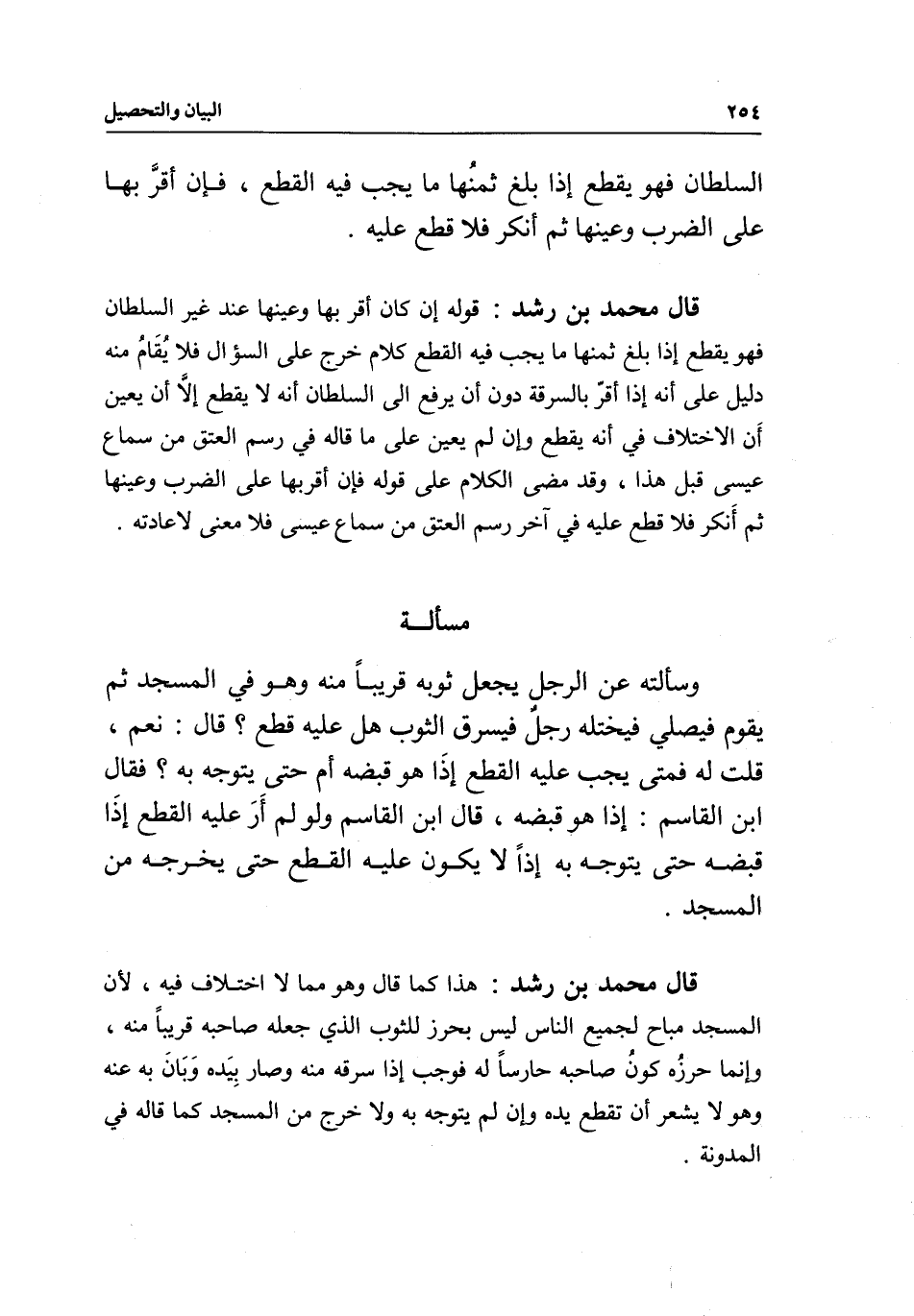 قال محمد بن رشد: هذا كما قال، وهو مما لا اختلاف فيه؛ لأن المسجد مباح لجميع الناس ليس بحرز للثوب الذي جعله صاحبه قريبا منه، وإنما حرزه كون صاحبه حارسا له فوجب إذا سرقه منه وصار بيده وبان به عنه وهو لا يشعر أن تقطع يده، وإن لم يتوجه به ولا خرج من المسجد كما قاله في المدونة.