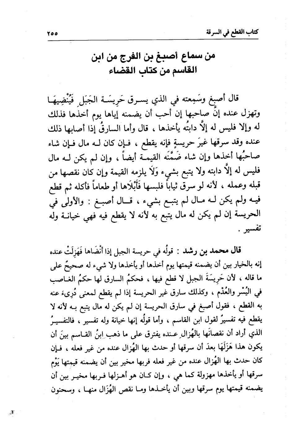من سماع أصبغ بن الفرج من ابن القاسم من كتاب القضاء قال أصبغ وسمعته في الذي يسرق حريسة الجبل فينضيها وتهزل عنده: إن صاحبها إن أحب أن يُضَمِّنَه إياها يوم أخذها فذلك له، وإلا فليس له إلا دابته يأخذها، قال: وأما السارق إذا أصابها ذلك عنده وقد سرقها غير حريسة فإنه يقطع، فإن كان له مال فإن شاء صاحبها أخذها وإن شاء ضمنه القيمة أيضا، وإن لم يكن له مال فليس له إلا دابته ولا يتبع بشيء ولا يلزمه القيمة وإن كان نقصها من قبله وعمله؛ لأنه لو سرق ثيابا فلبسها فأبلاها أو طعاما فأكله ثم قطع فيه ولم يكن له مال لم يتبع بشيء، قال أصبغ: والأولى في الحريسة إن لم يكن له مال يتبع به؛ لأنه لا يقطع فيه فهي خيانة وله تفسير.