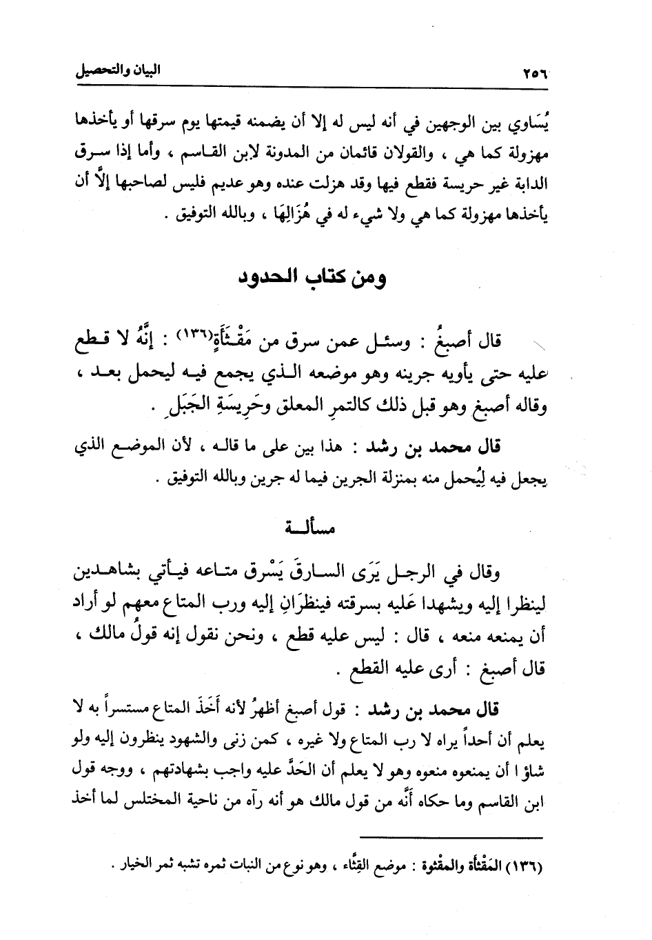 ومن كتاب الحدود قال أصبغ: وسئل عمن سرق من مقثأة: إنه لا قطع عليه حتى يأويه جرينه، وهو موضعه الذي يُجمع فيه ليُحمل بعدُ، وقاله أصبغ، وهو قبل ذلك كالتمر المعلق وحريسة الجبل.