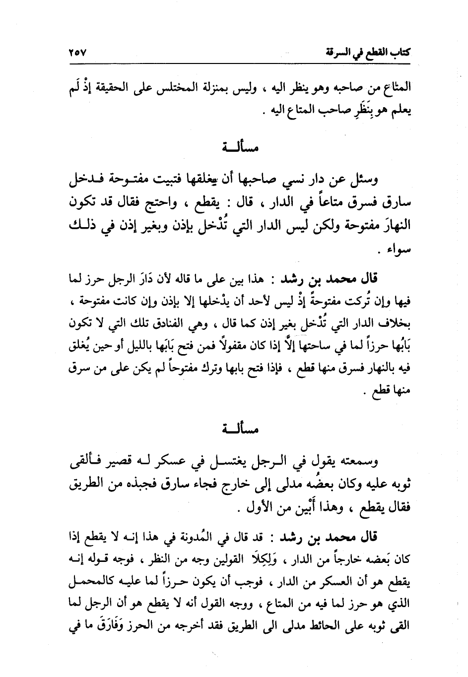 قال محمد بن رشد: هذا بين على ما قاله لأن دار الرجل حرز لما فيها وإن تركت مفتوحة إذ ليس لأحد أن يدخلها إلا بإذن وإن كانت مفتوحة، بخلاف الدار التي تدخل بغير إذن كما قال، وهي الفنادق تلك التي لا تكون بابها حرزا لما في ساحتها إلا إذا كان مقفولا، فمن فتح بابها بالليل أو حين يغلق فيه بالنهار فسرق منها قطع، فإذا فتح بابها وترك مفتوحا لم يكن على من سرق منها قطع.