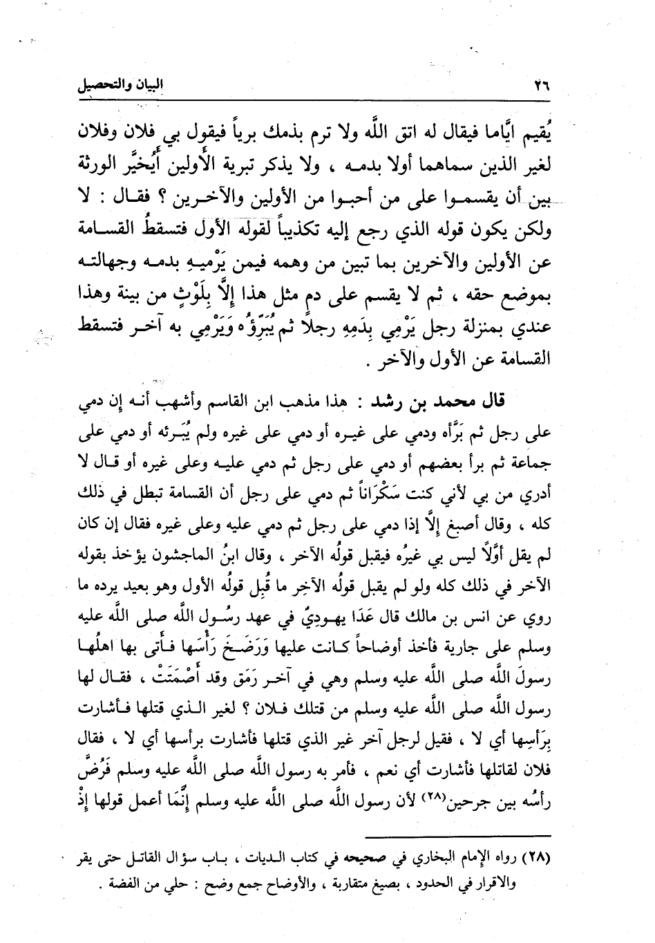 قال محمد بن رشد: هذا مذهب ابن القاسم وأشهب أنه إن دمي على رجل ثم برأه ودمي على غيره أو دمي على غيره ولم يبرئه أو دمي على جماعة ثم برأ بعضهم أو دمي على رجل ثم دمي عليه وعلى غيره أو قال لا أدري من بي لأني كنت سكرانا ثم دمي على رجل أن القسامة تبطل في ذلك كله، وقال أصبغ إلا إذا دمي على رجل ثم دمي عليه وعلى غيره فقال: إن كان لم يقل أولا ليس بي غيره فيقبل قوله الآخر، وقال ابن الماجشون يؤخذ بقوله الآخر في ذلك كله ولو لم يقبل قوله الآخر ما قبل قوله الأول وهو بعيد يرده ما روي عن أنس بن مالك قال «عدا يهودي في عهد رسول الله - صَلَّى اللَّهُ عَلَيْهِ وَسَلَّمَ - على جارية فأخذ أوضاحا كانت عليها ورضخ رأسها فأتى بها أهلها رسول الله - صَلَّى اللَّهُ عَلَيْهِ وَسَلَّمَ - وهي في آخر رمق وقد أصمتت، فقال لها رسول الله - صَلَّى اللَّهُ عَلَيْهِ وَسَلَّمَ - من قتلك فلان؟ لغير الذي قتلها فأشارت برأسها أي لا، فقيل لرجل آخر غير الذي قتلها فأشارت برأسها أي لا، فقال فلان لقاتلها فأشارت أي نعم، فأمر به رسول الله - صَلَّى اللَّهُ عَلَيْهِ وَسَلَّمَ - فرض رأسه بين جرحين» لأن رسول الله - صَلَّى اللَّهُ عَلَيْهِ وَسَلَّمَ - إنما أعمل قولها إذ