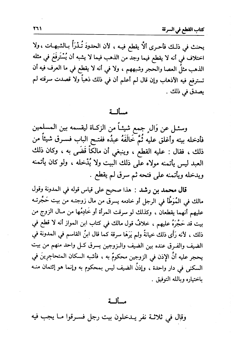 مسألة وسئل عن وال جمع شيئا من الزكاة ليقسمه بين المسلمين فأدخله بيته وأغلق عليه ثم خالفه عبده ففتح الباب فسرق شيئا من ذلك، فقال: عليه القطع، وينبغي أن مالكا قضى به، وكان ذلك العبد ليس يأتمنه مولاه على ذلك البيت ولا يدخله، ولو كان يأتمنه ويدخله ويأتمنه على فتحه ثم سرق لم يقطع.