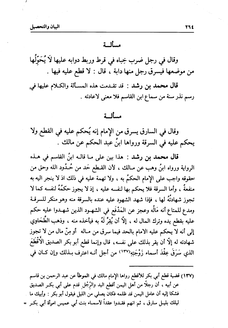 قال محمد بن رشد: هذا بين على ما قاله ابن القاسم في هذه الرواية ورواه ابن وهب عن مالك؛ لأن القطع حد من حدود الله وحق من حقوقه واجب على الإمام الحكم به، ولا تهمة عليه في ذلك إذ لا ينجر إليه به منفعة، وأما السرقة فلا يحكم بها لنفسه عليه، إذ لا يجوز حكمه لنفسه كما لا تجوز شهادته لها، فإذا شهد الشهود عليه عنده بالسرقة منه وهو منكر للسرقة ومدع للمتاع أنه ماله وعجز عن المدفع في الشهود الذين شهدوا عليه حكم عليه بقطع يده وترك المال له، إلا أن يقر له به فيأخذه منه، وذهب الطحاوي إلى أنه لا يحكم عليه الإمام بالحد فيما سرق من ماله أو من مال من لا تجوز شهادته له إلا أن يقر بذلك على نفسه، قال: وإنما قطع أبو بكر الصديق الأقطع الذي سرق عقد أسماء زوجته من أجل أنه اعترف بذلك وإن كان في
