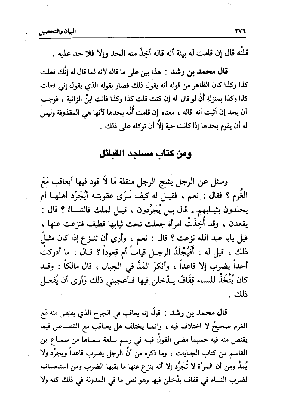 ومن كتاب مساجد القبائل وسئل عن الرجل يشج الرجل منقلة ما لا قود فيها أيعاقب مع الغرم؟ فقال: نعم، فقيل له كيف ترى عقوبته أيجرد أهلها أم يجلدون بثيابهم؟ قال: بل يجردون، قيل لمالك فالنساء؟ قال: يقعدن، وقد أخذت امرأة جعلت تحت ثيابها قطيفا فنزعت عنها، قيل يا أبا عبد الله نزعت؟ قال: نعم، وأرى أن تنزع إذا كان مثل ذلك، قيل له: أفيجلد الرجل قياما أم قعودا؟ قال: ما أدركت أحدا يضرب إلا قاعدا، وأنكر المد في الحبال، قال مالك: وقد كان يتخذ للنساء قفاف يدخلن فيها فأعجبني ذلك وأرى أن يفعل ذلك.