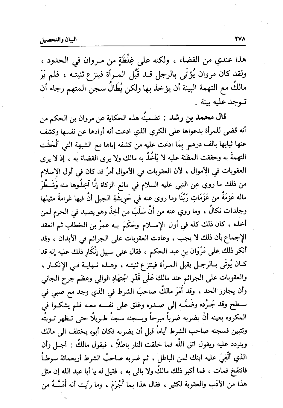 قال محمد بن رشد: تضمينه هذه الحكاية عن مروان بن الحكم من أنه قضى للمرأة بدعواها على الكري الذي ادعت أنه أرادها عن نفسها وكشف عنها ثيابها بألف درهم بما ادعت عليه من كشفه إياها مع الشبهة التي ألحقت التهمة به وحققت المظنة عليه لا يأخذ به مالك ولا يرى القضاء به، إذ لا يرى العقوبات في الأموال؛ لأن العقوبات في الأموال أمر قد كان في أول الإسلام، من ذلك «ما روي عن النبي - عَلَيْهِ السَّلَامُ - في مانع الزكاة: إنا آخذوها منه وشطر ماله عزمة من عزمات ربنا» «وما روي عنه في حريسة الجبل: أن فيها غرامة مثيلها وجلدات نكال» «وما روي عنه من أن سلب من أخذ وهو يصيد في الحرم لمن أخذه» كان ذلك كله في أول الإسلام وحكم به عمر بن الخطاب ثم انعقد الإجماع بأن ذلك لا يجب، وعادت العقوبات على الجرائم في الأبدان، وقد أنكر ذلك على مروان بن عبد الحكم، فقال على سبيل إنكار ذلك عليه: إنه قد كان يؤتى بالرجل يقبل المرأة فينتزع ثنيته، وهذه نهاية في الإنكار، والعقوبات على الجرائم عند مالك على قدر اجتهاد الوالي وعظم جرح الجاني وأن يجاوز الحد، وقد أمر مالك صاحب الشرط في الذي وجد مع صبي في سطح وقد جرده وضمه إلى صدره وغلق على نفسه معه فلم يشكوا في المكروه بعينه أن يضربه ضربا مبرحا ويسجنه سجنا طويلا حتى تظهر توبته وتتبين، فسجنه صاحب الشرط أياما قبل أن يضربه فكان أبوه يختلف إلى مالك ويتردد عليه ويقول اتق الله فما خلقت النار باطلا، فيقول مالك: أجل وإن الذي ألفي عليه ابنك لمن الباطل، ثم ضربه صاحب الشرط أربعمائة سوط فانتفخ فمات، فما أكبر ذلك مالك ولا بالى به، فقيل له يا أبا عبد الله إن مثل هذا من الأدب والعقوبة لكثير، فقال هذا بما أجرم، وما رأيت أنه أمسه من