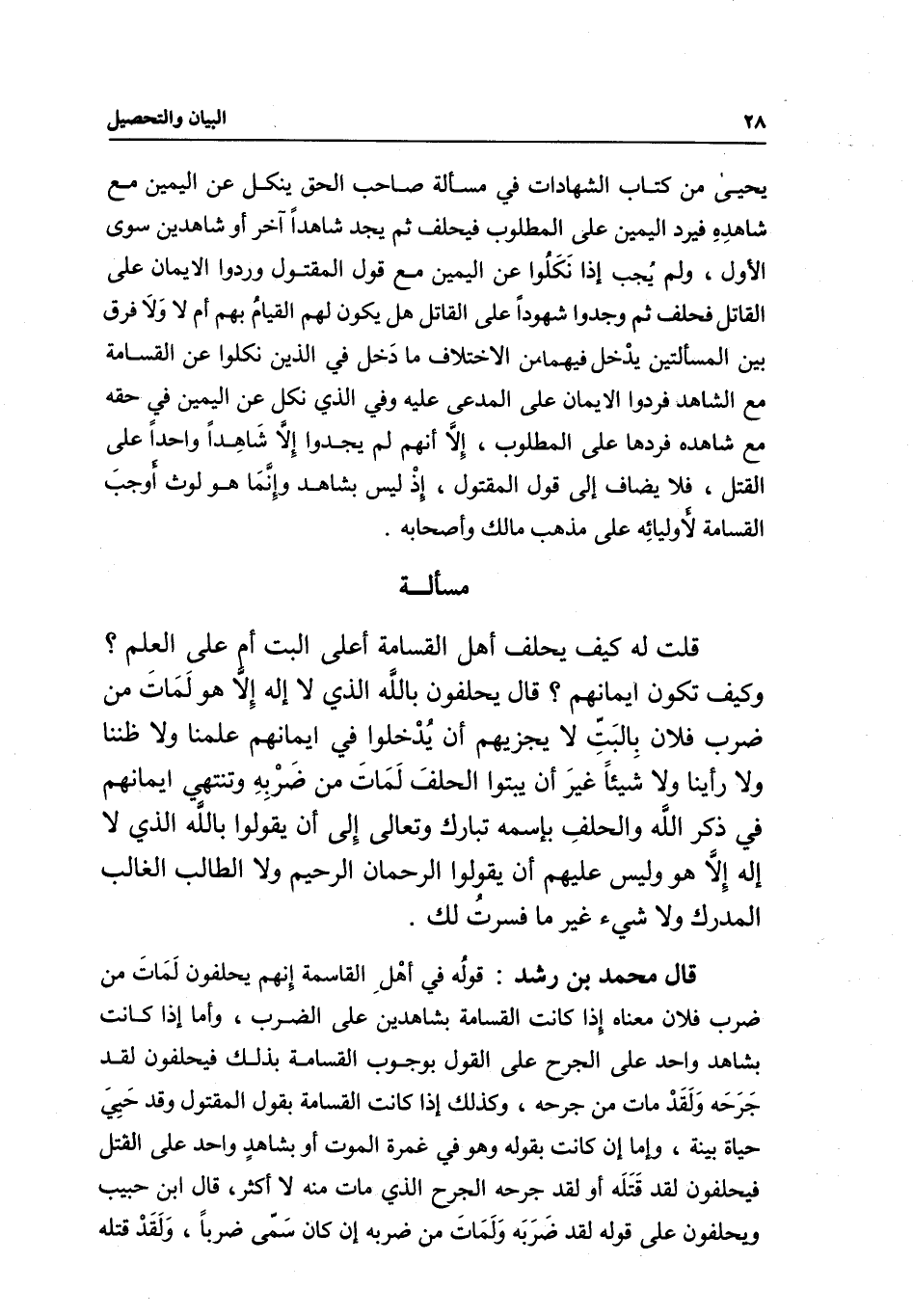 مسألة قلت له كيف يحلف أهل القسامة أعلى البت أم على العلم؟ وكيف تكون أيمانهم؟ قال يحلفون بالله الذي لا إله إلا هو لمات من ضرب فلان بالبت لا يجزيهم أن يدخلوا في أيمانهم علمنا ولا ظننا ولا رأينا ولا شيئا غير أن يبتوا الحلف لمات من ضربه وتنتهي أيمانهم في ذكر الله والحلف باسمه تبارك وتعالى إلى أن يقولوا بالله الذي لا إله إلا هو وليس عليهم أن يقولوا الرحمن الرحيم ولا الطالب الغالب المدرك ولا شيء غير ما فسرت لك.